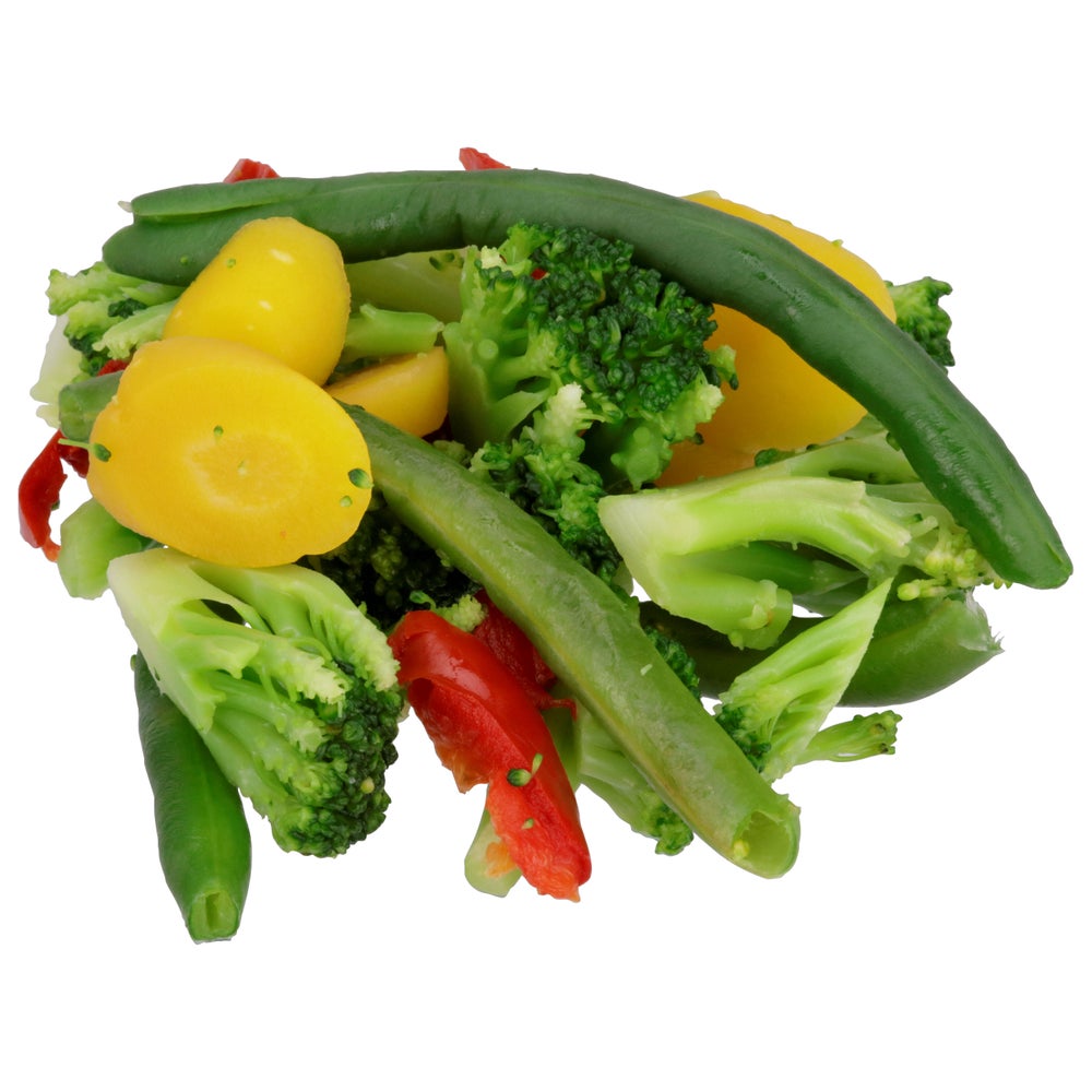 This brightly colored blend of vegetables features whole broccoli florets, bias-sliced yellow carrots, whole green beans, and red pepper strips.