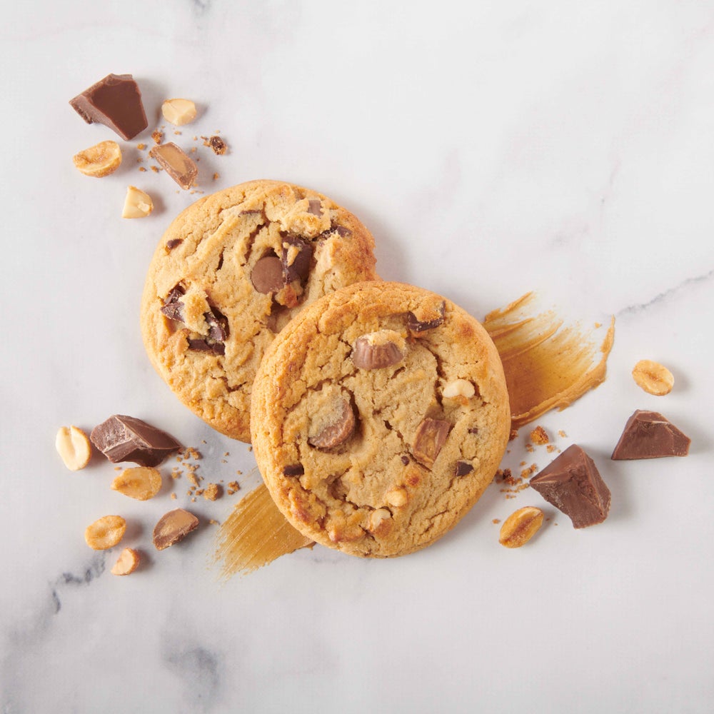 - Carefully crafted and packed with the finest ingredients, these irresistible prebaked peanut butter cookies are made with real creamy peanut butter, mini peanut butter cups, honey-roasted peanuts and bits of dark chocolate.