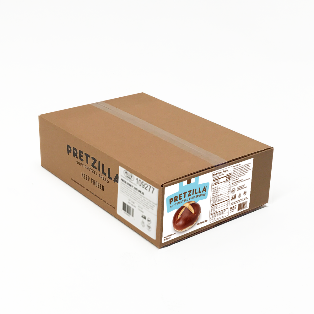 Pretzilla Pretzel Hamburger Buns, 4.2 Inch, Sliced, Frozen, 6 Ct Package, 4/Case