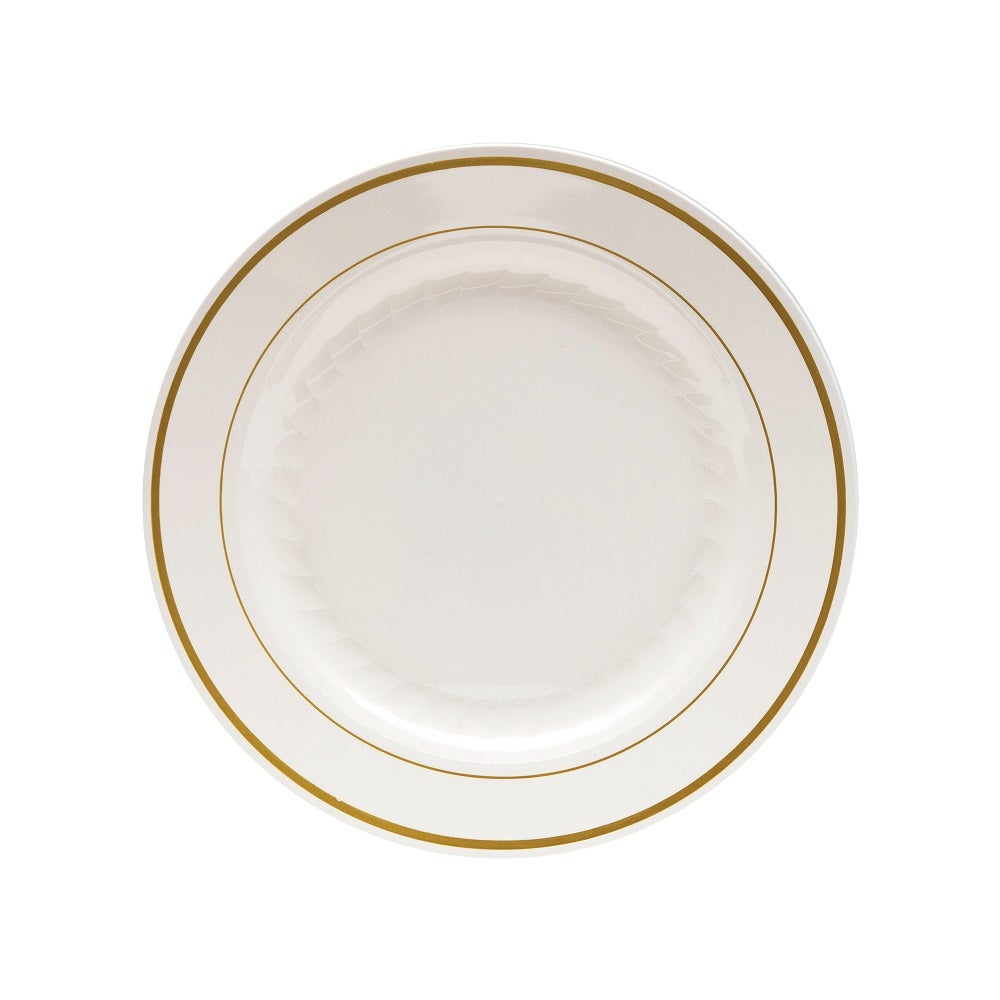 Masterpiece 7.5 Inch Plastic Plates, Ivory with Gold Trim, Polystyrene, 15 Ct Package, 10/Case