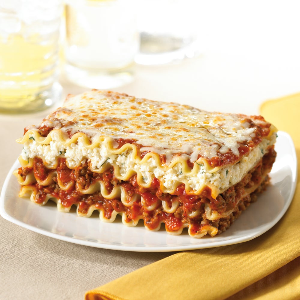 - The homestyle recipe features fresh curly lasagna noodles hand-layered with creamy ricotta cheese, Italian meat sauce, tomatoes, celery, carrot and a topping of mozzarella and Parmesan cheeses.