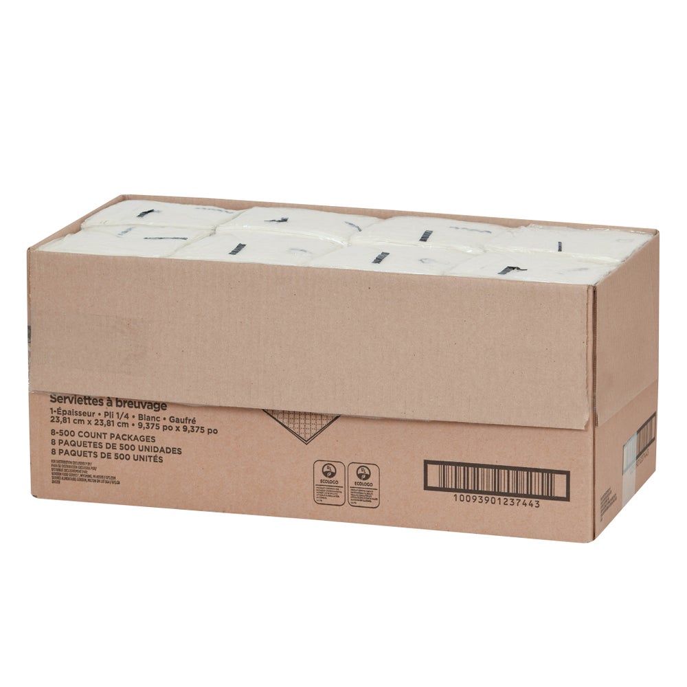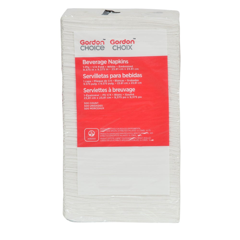 Gordon Choice 1-Ply Embossed Beverage Napkins, White, 1/4 Fold, 10 x 10 Inch, Poly-Packed, 500 Ct Package, 8/Case