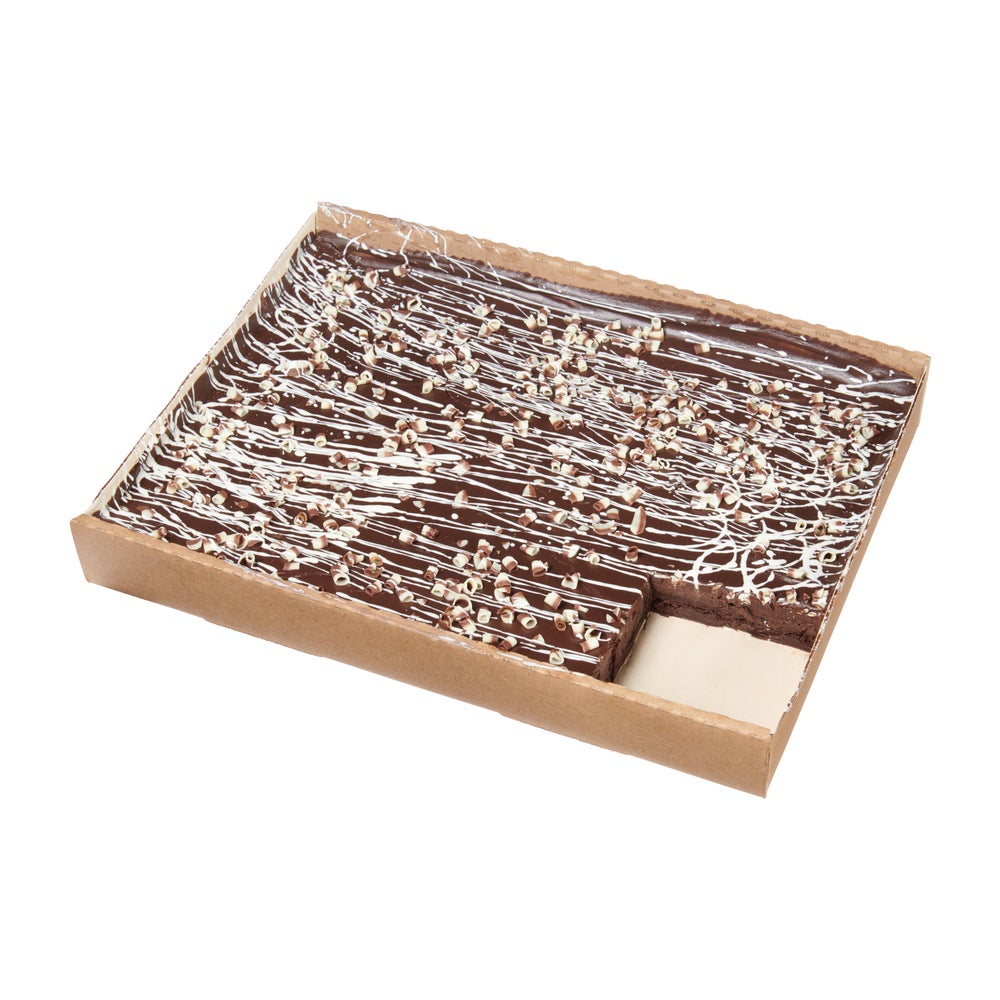 • Rich, sumptuously chewy and visually appealing, these brownies are adorned with chocolate icing and a drizzle of white icing, then finished with Belgium white and milk chocolate curls.