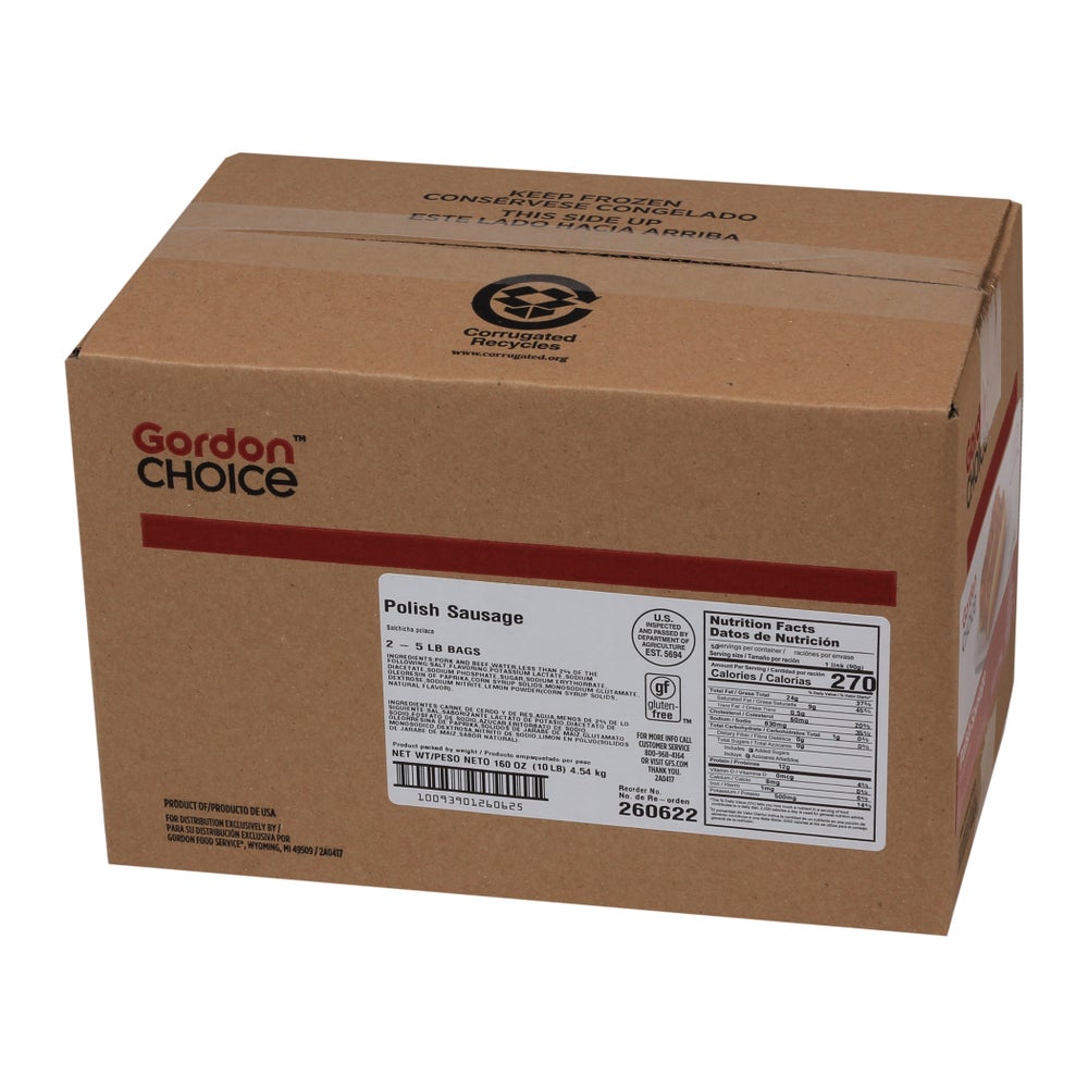Gordon Choice Smoked Polish Beef & Pork Sausage, 6 Inch, Links, 5 Count Per Pound, Cooked, Frozen, 5 Lb Bag, 2/Case