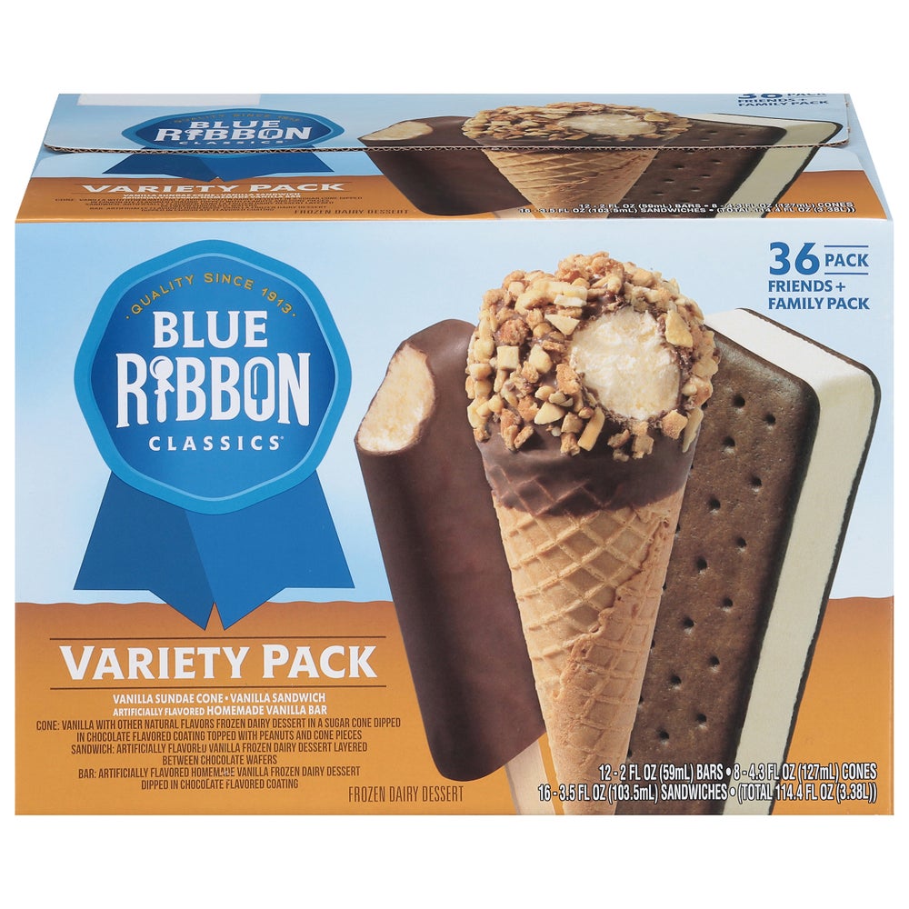 Blue Ribbon Assorted Vanilla Novelty Ice Cream Bars, with Ice Cream Bars/Ice Cream Sandwiches/Ice Cream Cones, Frozen, 36 Ct Package, 1/Case