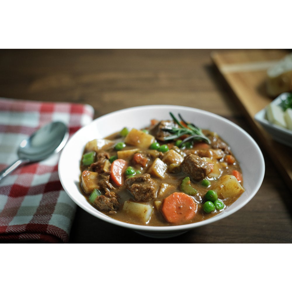 - Enjoy a homestyle, hearty meal with this stew, consisting of tender diced beef, coin-sliced carrots, garden-fresh peas, celery and diced potatoes in a rich beef gravy.