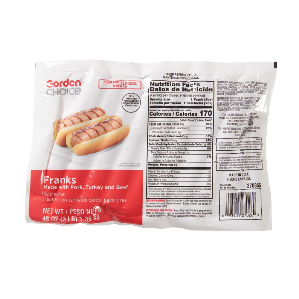 Gordon Choice 3 Meat Franks, 6 Inch, 8 Count per Pound, Fresh, 3 Lb Package, 12/Case