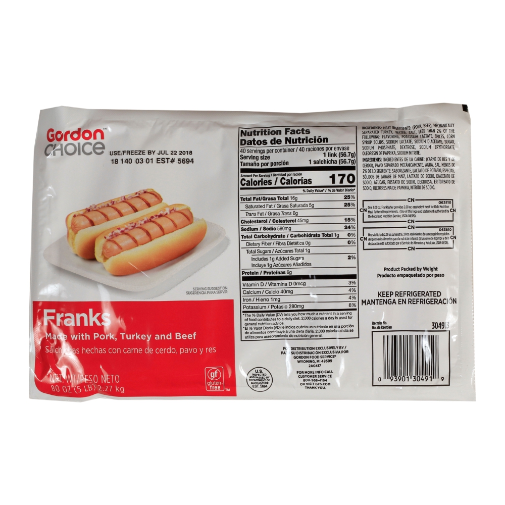 Gordon Choice 3 Meat Franks, 6 Inch, 8 Count per Pound, Fresh, 5 Lb Bag, 2/Case