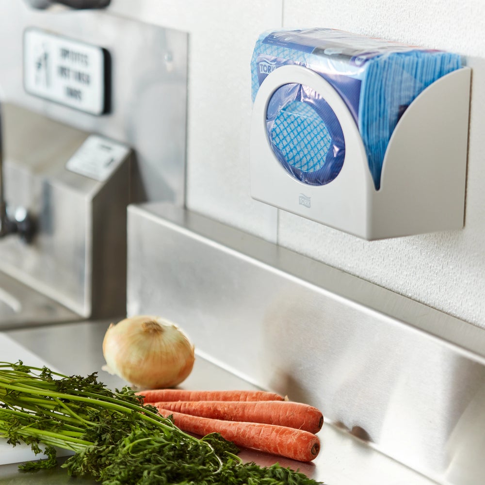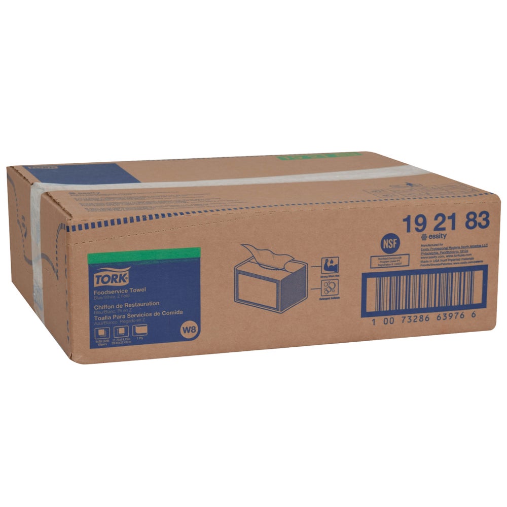 Tork Foodservice Cleaning Towel Blue/White W8: Keep foodservice cleaning Towels free from dust, dirt, moisture and spills with our Tork compact poly-wrapped protected packaging. A self-dispensing packaging provides easy access to these foodservice towels. These foodservice towels meet all your cleaning needs and are suitable for use with most sanitizers, disinfectants and detergents. They are specially designed to be used with quat-based sanitizers and unlike cotton towels, remain odorless for a better front-of-house experience.