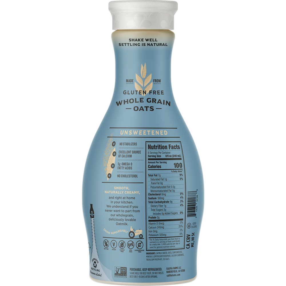 Califia Farms oat milks are made with plant-based, dairy-free ingredients that are Non-GMO Certified, glyphosate free, Kosher, vegan, and free from carrageenan. Made with gluten-free oats. All the smooth creaminess you expect from dairy milk, just without the dairy.