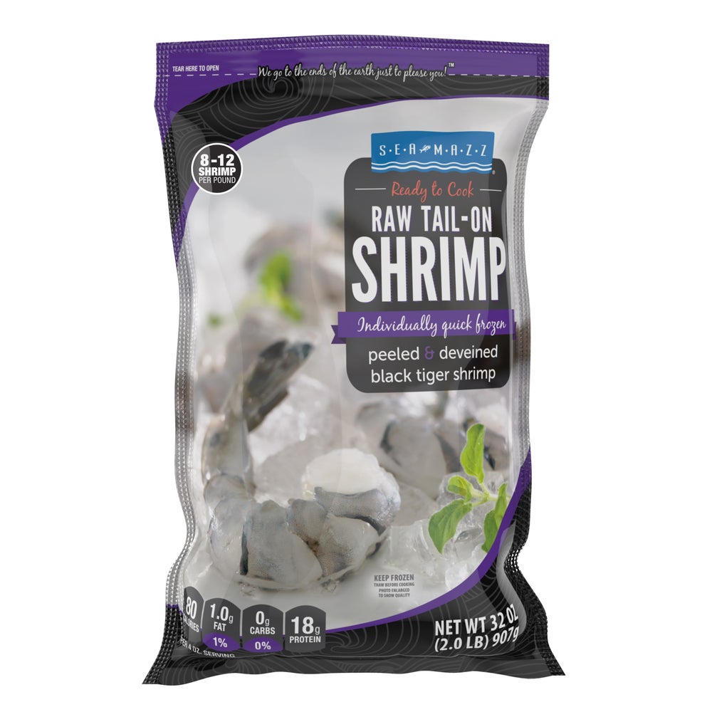 Seamazz Black Tiger Shrimp, Peeled & Deveined, Tail-On, 8-12 Count per Pound, Raw, Individually Quick Frozen, 2 Lb Package, 10/Case