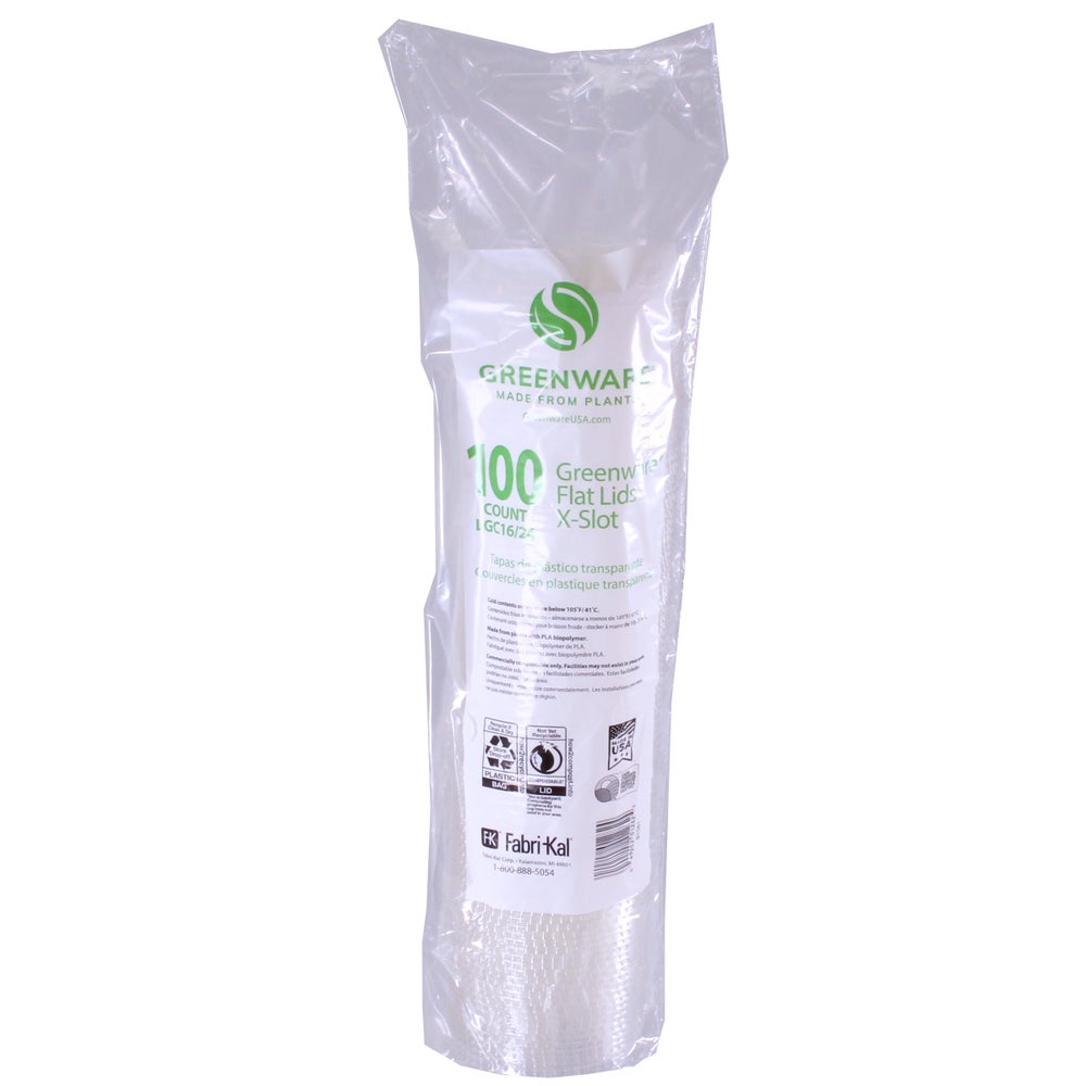 Greenware X-Slot Plastic Lids, Compostable, Clear, PLA, for 16, 20, 24 Ounce Cups, 100 Ct Package, 10/Case