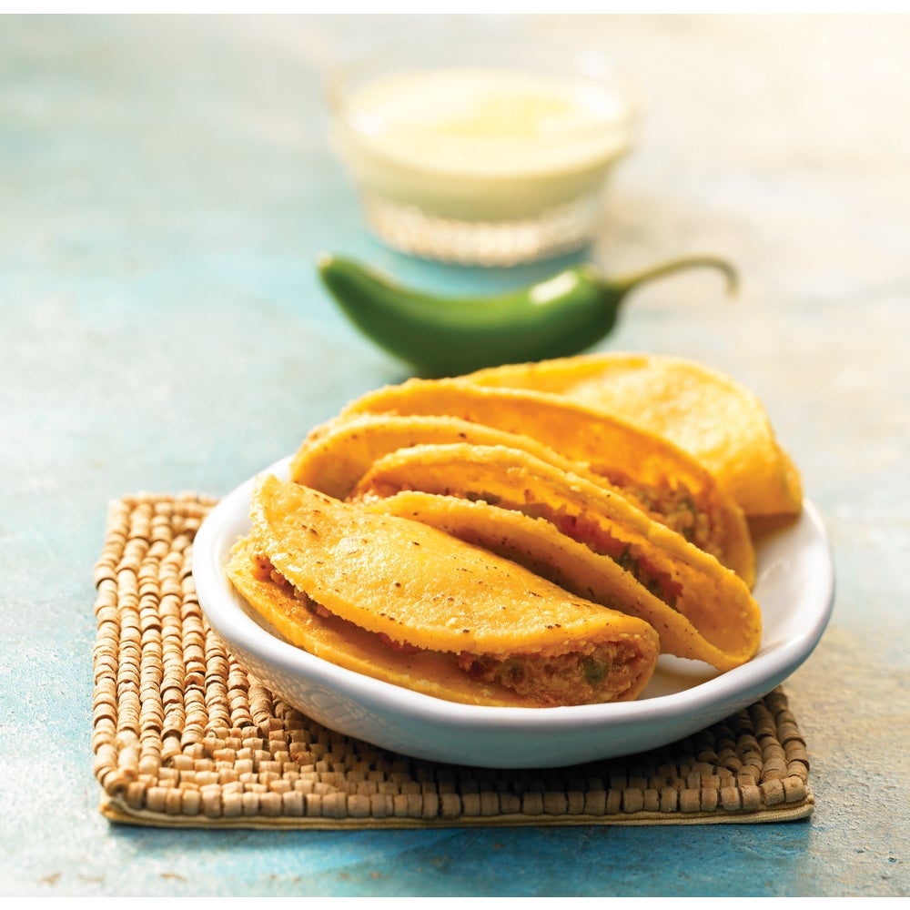 These mini tacos contain chicken, onions, and red chili peppers in a corn tortilla. They are versatile enough for use as an appetizer or on a combination platter.