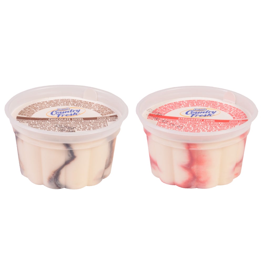 Fresh vanilla ice cream is swirled with either chocolate or strawberry sauce in convenient single-serve cups. This assortment of easy-to-serve sundaes provides a couple of flavor options for treats on-the-go, group outings, camps, healthcare facilities, schools, and a myriad of other applications.