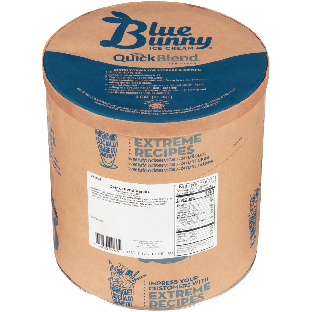 Wells Blue Bunny Quick Blend Vanilla Hard Serve Ice Cream, Frozen, 3 Gal, 1/Case