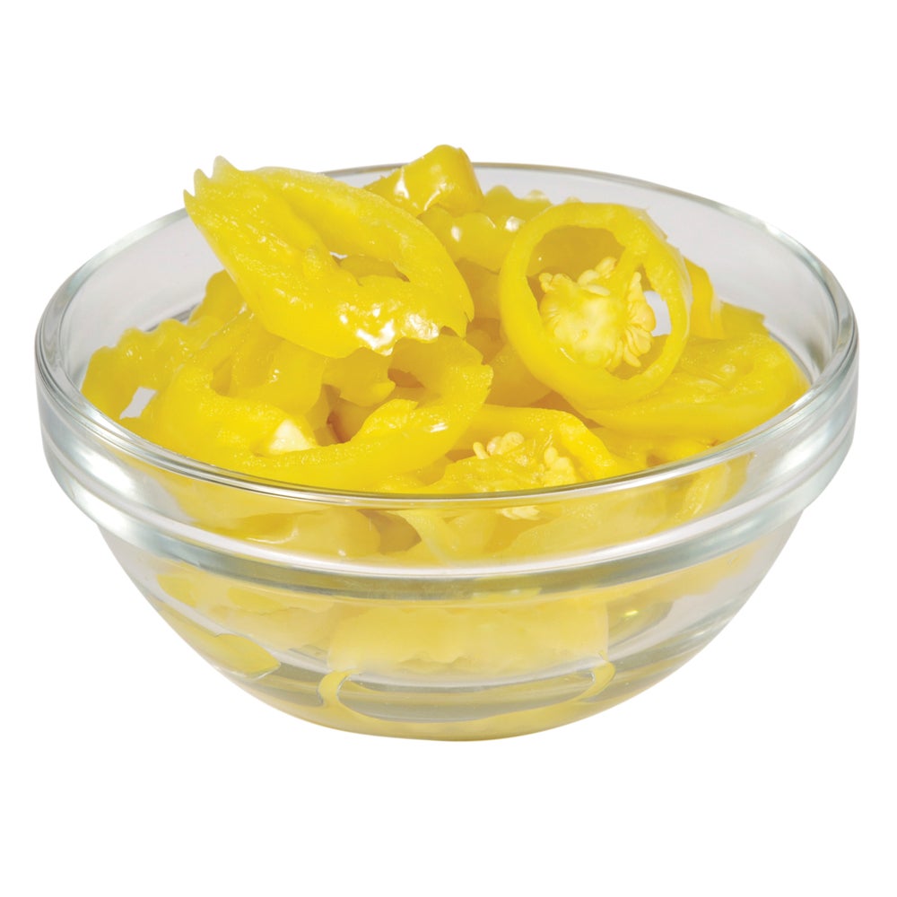 - Sliced banana peppers are vibrantly colored and bring excitement. These sliced banana peppers feature a hot taste and a crisp texture. Each package contains minimal stems and caps. These peppers may be used in a variety of applications.