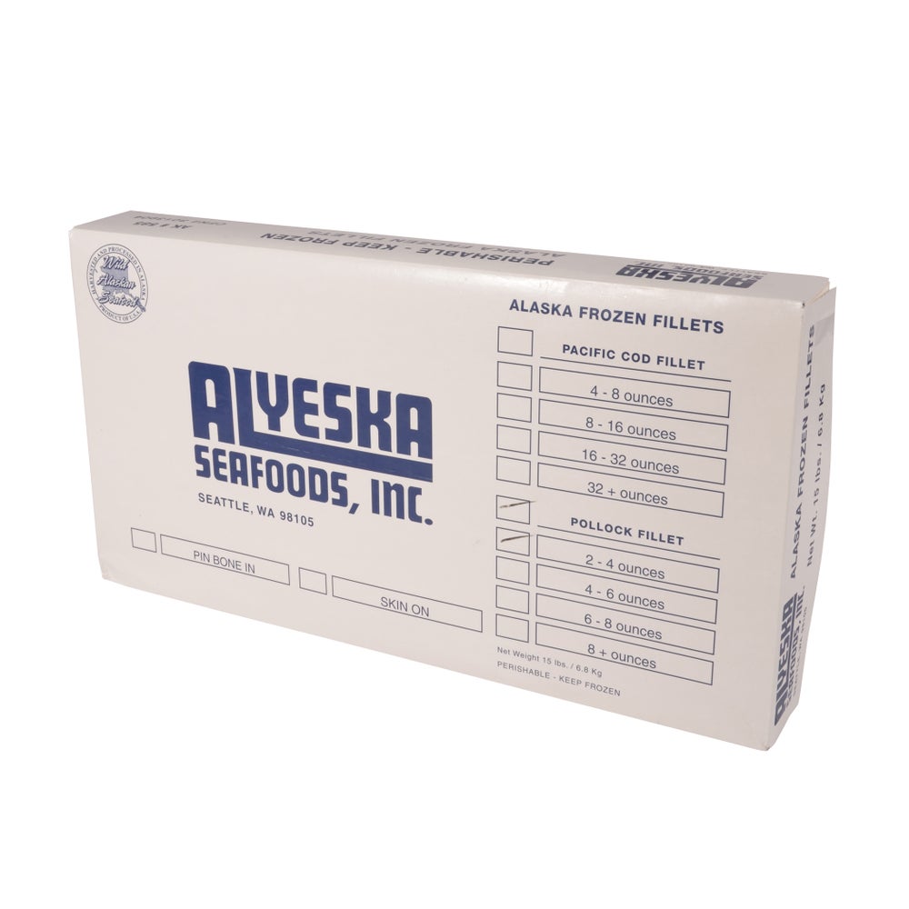 packer label Alaskan Pollock Fillets, Wild-Caught, Boneless Skinless, 2-4 Ounce, Raw, Once-Frozen Shatter-Pack, 15 Lb Box, 3/Case