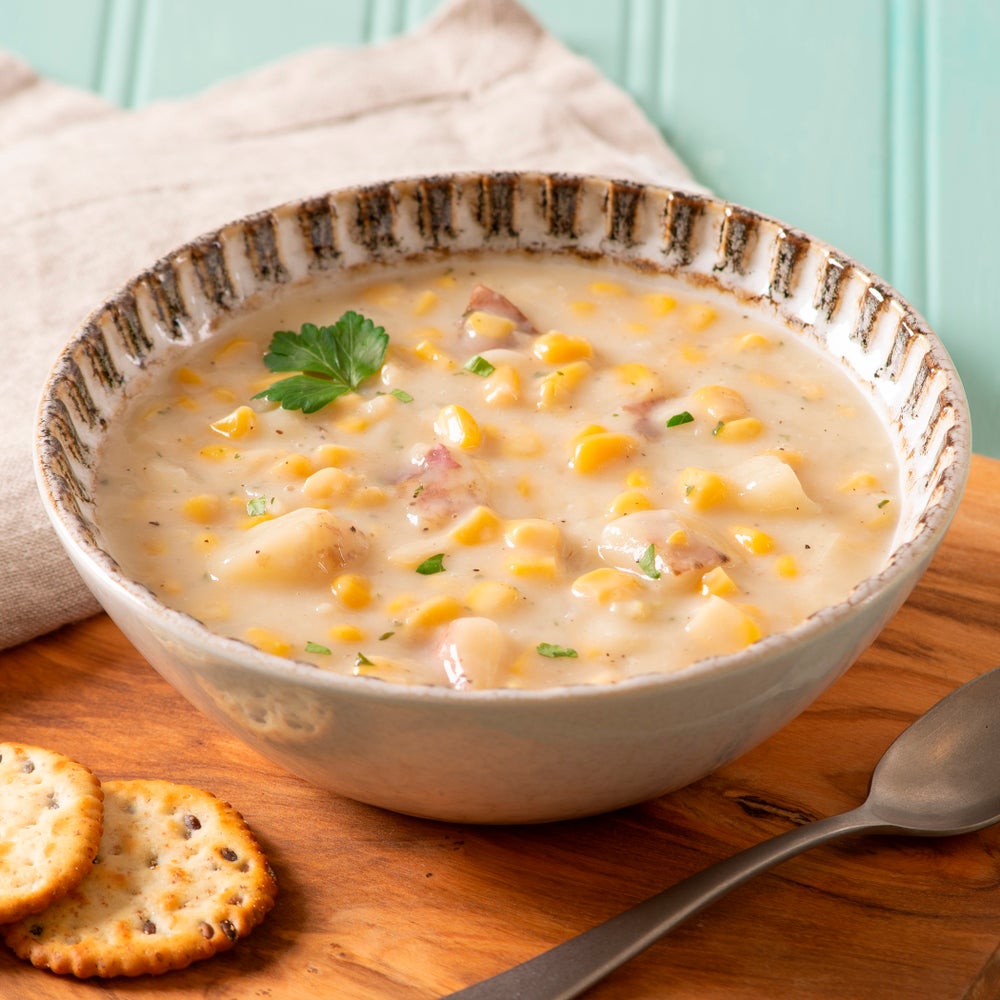 - Nothing says comfort on a cold winter day than a bowl of fresh, steaming corn chowder. Corn, potatoes, and onions are mixed in a creamy, fire-roasted base to provide a fully cooked, ready to serve soup or appetizer.