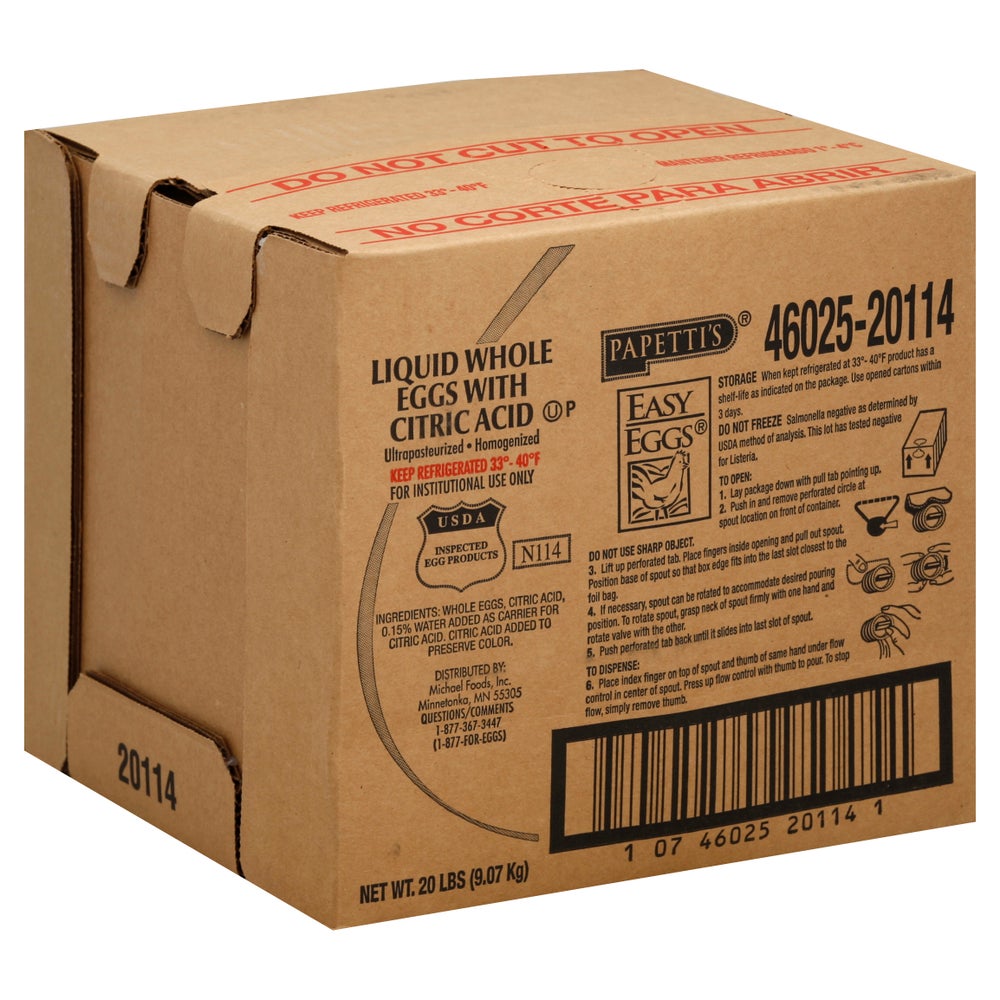 Papetti's Liquid Eggs, with Citric Acid, Pasteurized, Bag with Spout, Refrigerated, 20 Lb Bag, 1/Case