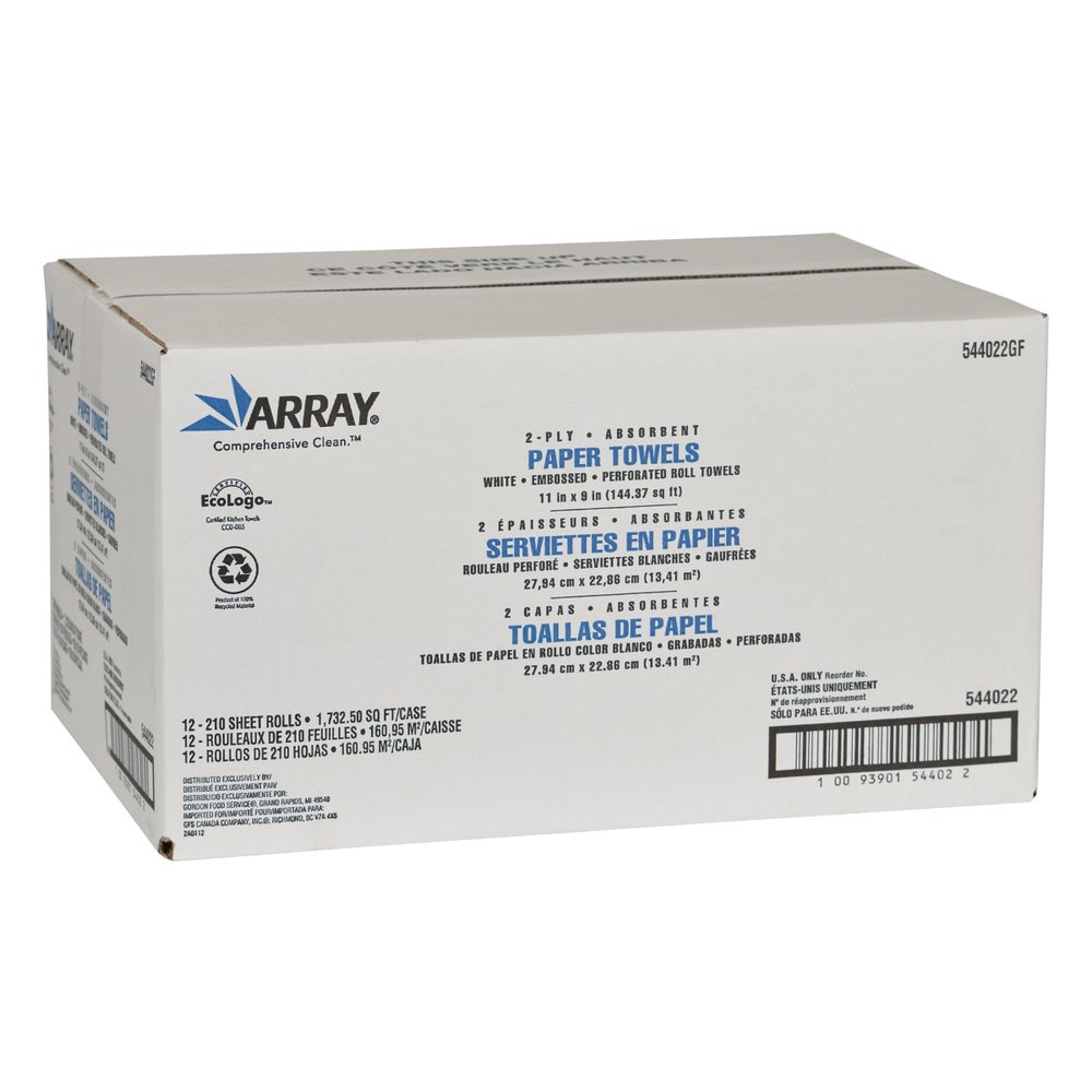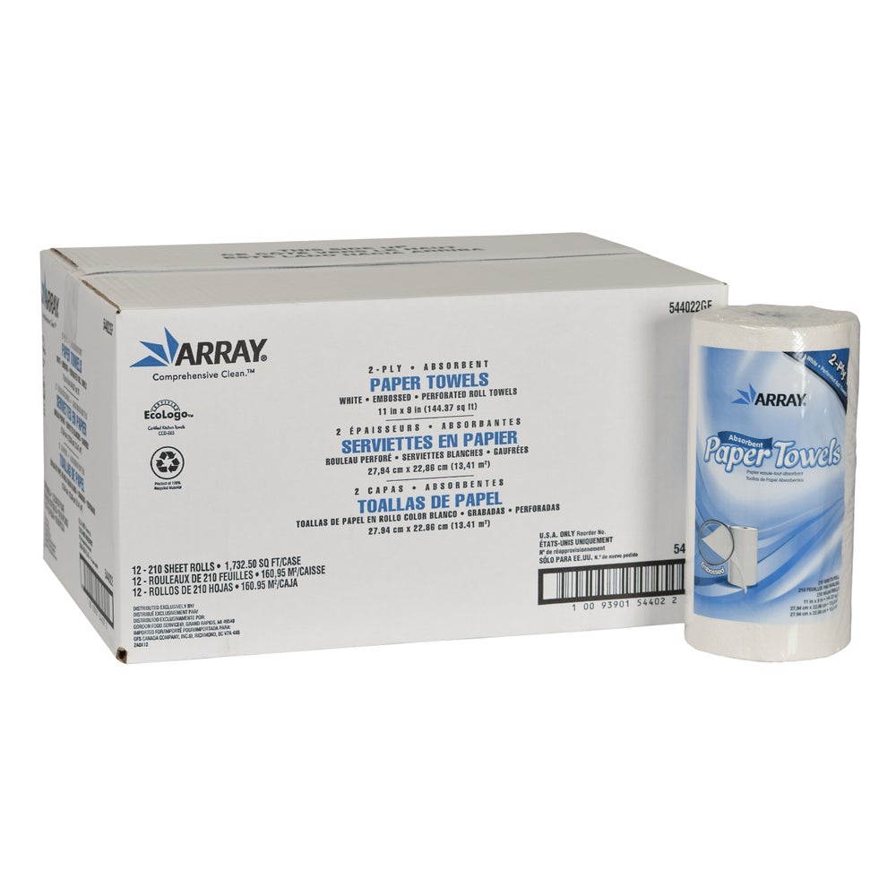 Array 2-Ply Perforated Roll Towels, White, 9 x 11 Inch, 100% Recycled Fibers, 210 Ct Package, 12/Case