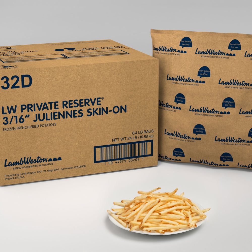 French Fries, Julienne Cut, 3/16 Inch, Extra Long Fancy, Skin-On, Frozen, 4 Lb Bag, 6 Per Case