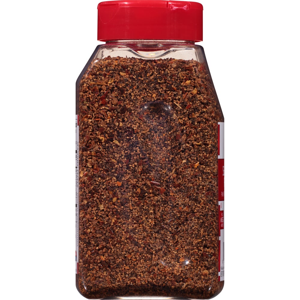 This seasoned pepper blend features black pepper, sugar, and sweet bell pepper which complements a variety of proteins, french fries, and chips.