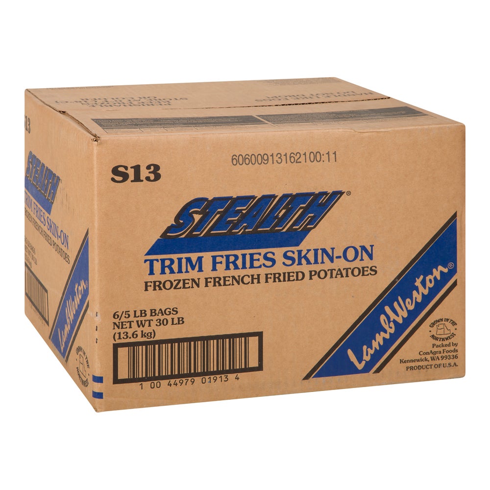 Stealth Fries 1/4 x 3/8 Inch Extra Long Fancy Trim Cut French Fries, Coated, Skin-On, Bakeable, Frozen, 5 Lb Bag, 6/Case
