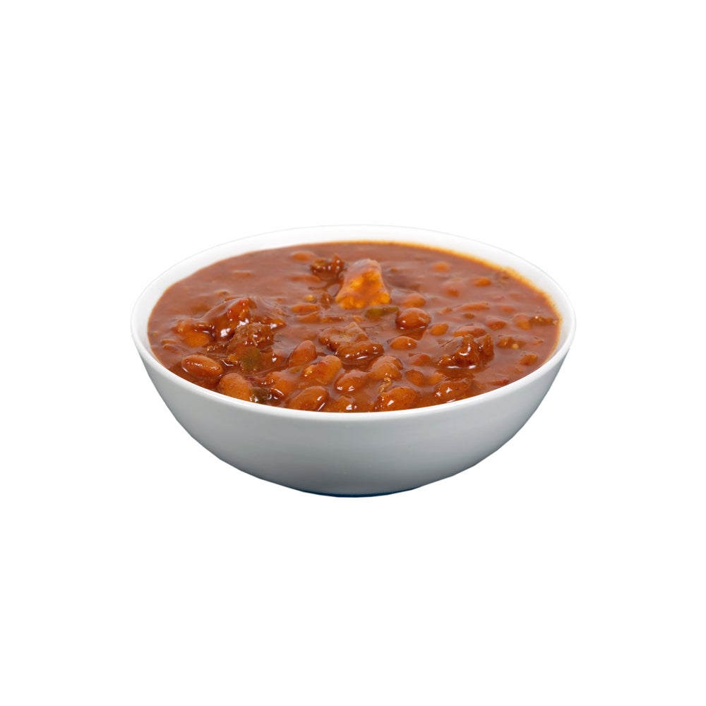 - Tender whole beans, chunks of fresh tomatoes, sliced jalapenos, diced green chiles and savory diced beef chunks flavor this traditional chili, accented by a rich, flavorful sauce.