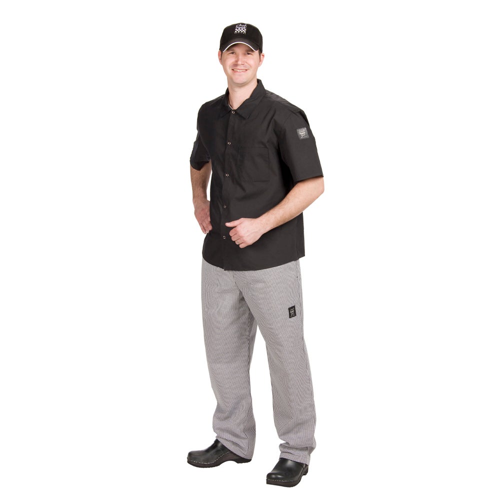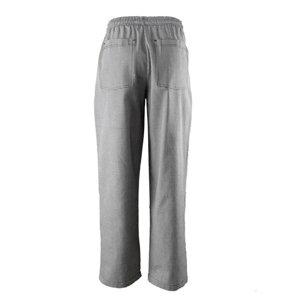 These relaxed-fit chef pants have an elastic waistband with a drawstring closure, and a front zipper for comfort. They feature an attractive houndstooth print. Two side pockets and two rear pockets offer lots of storage.