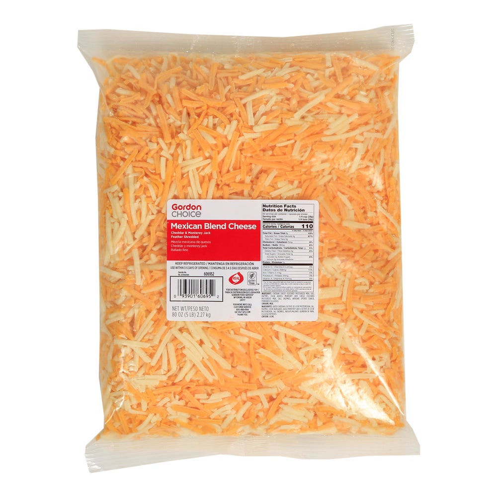 Gordon Choice Mexican Cheese Blend, Cheddar & Monterey Jack, Feather Shredded, 5 Lb Bag, 4/Case