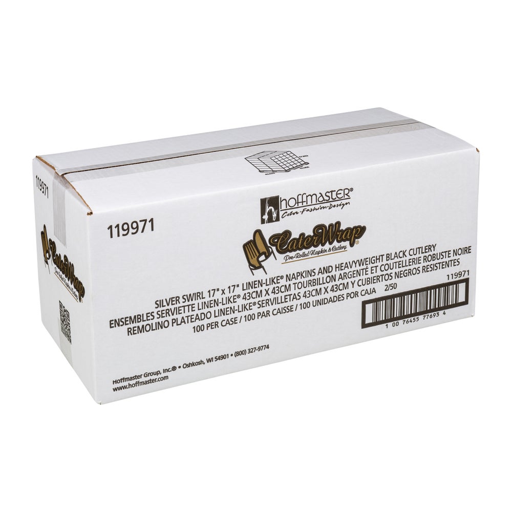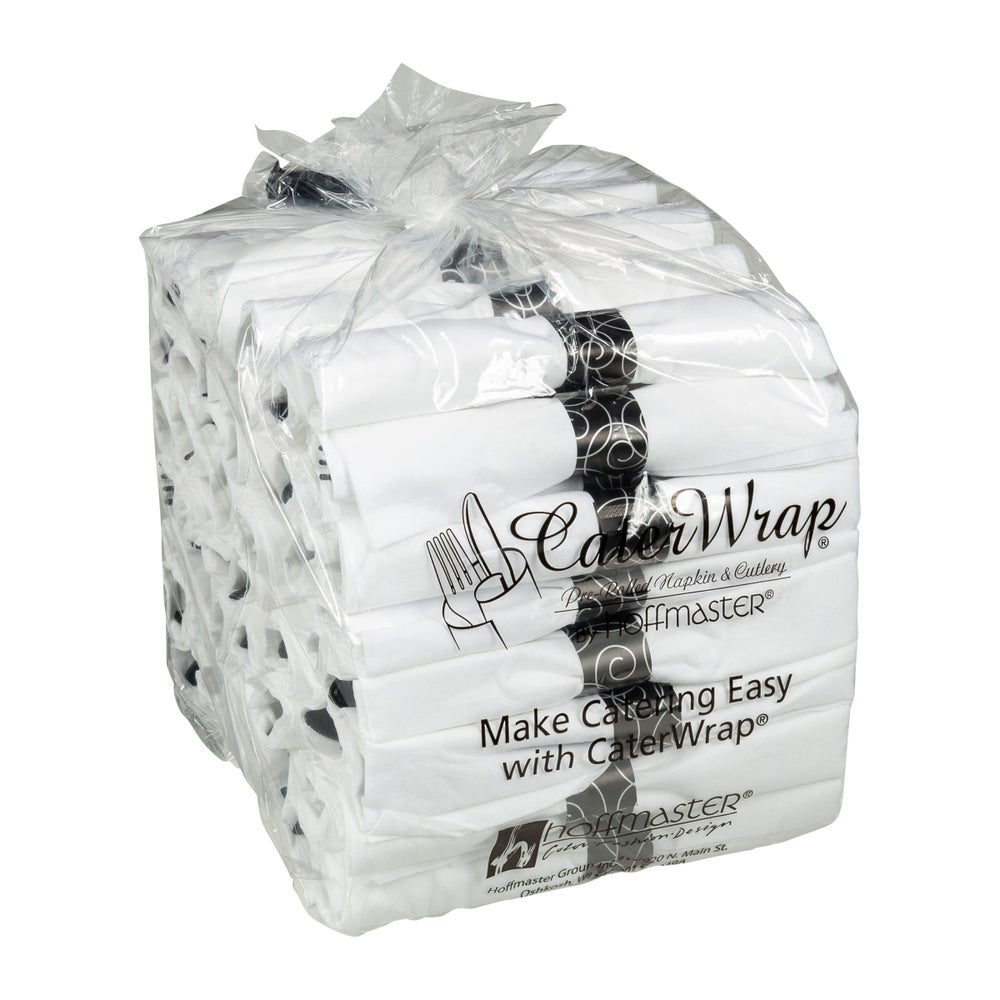 Hoffmaster Caterwrap Heavyweight Plastic Fork/Knife/Spoon Cutlery Kits, Black, with Napkin, Polystyrene, 50 Ct Package, 2/Case