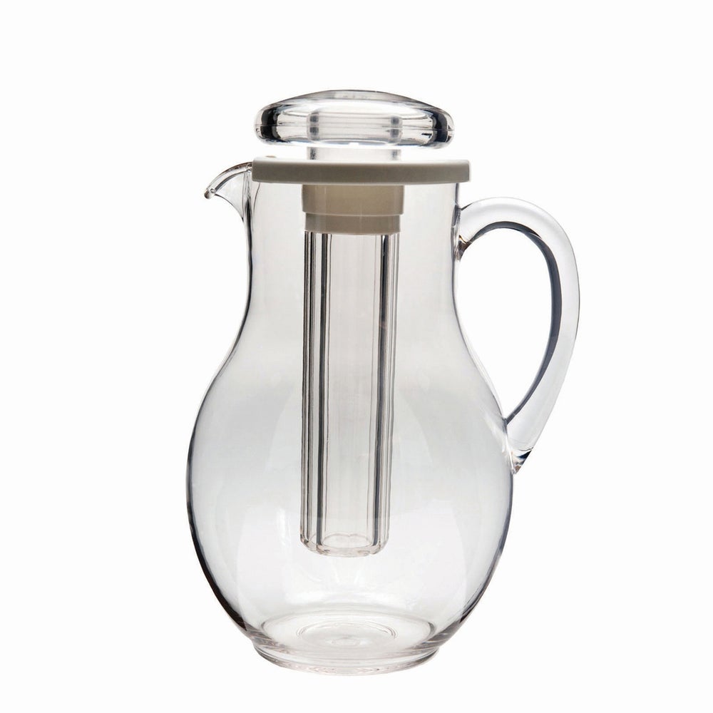 This clear beverage pitcher features an ice tube within, ensuring that cold beverages remain cold.