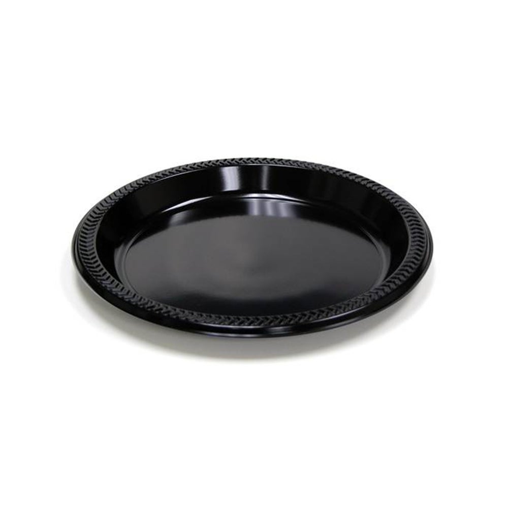 These ebony one-compartment plastic plates provide a smooth, rigid china-like luster with superior cut-resistance.