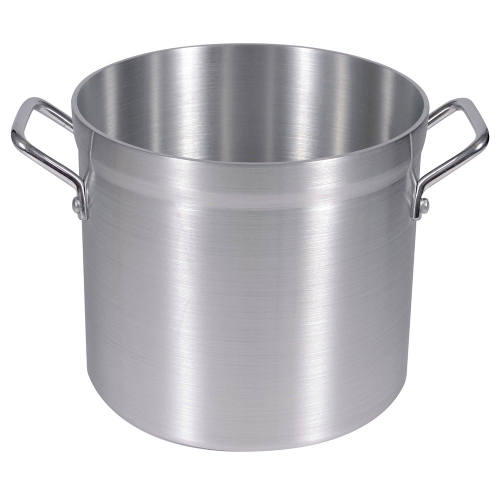 - This heavy-duty aluminum, 12-quart pot allows heat to spread evenly from the base up through the sidewalls to reliably simmer soups, stews and stocks.