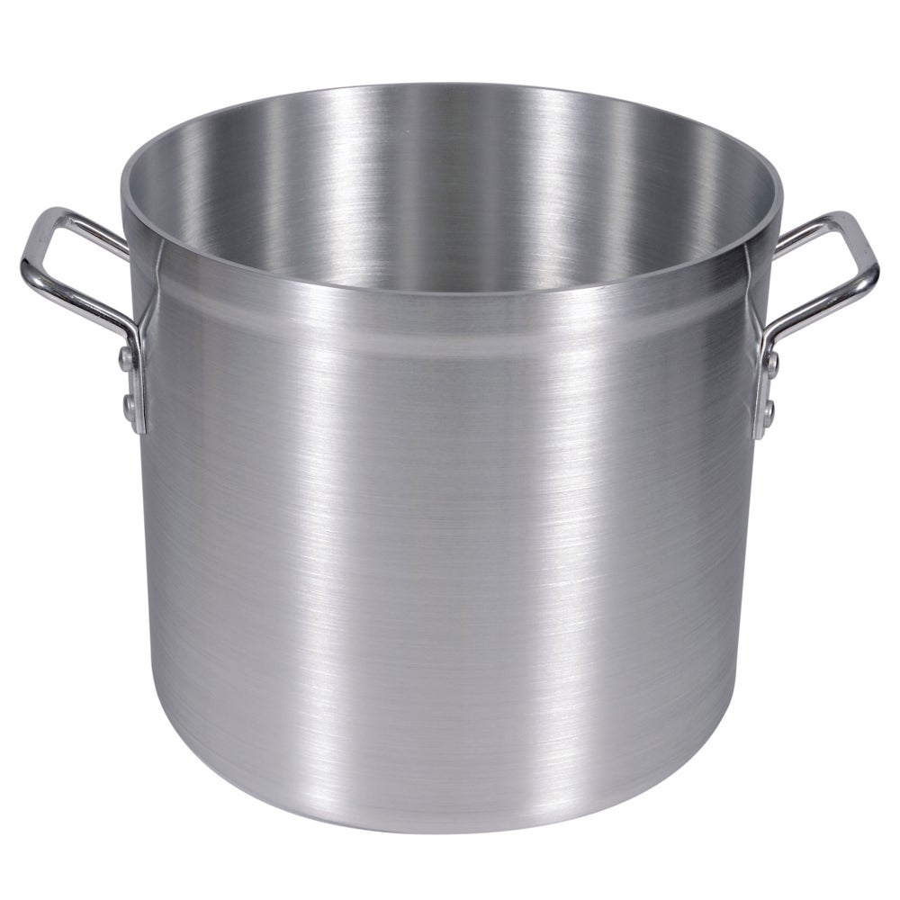 - This heavy-duty aluminum, 20-quart pot allows heat to spread evenly from the base up through the sidewalls to reliably simmer soups, stews and stocks.