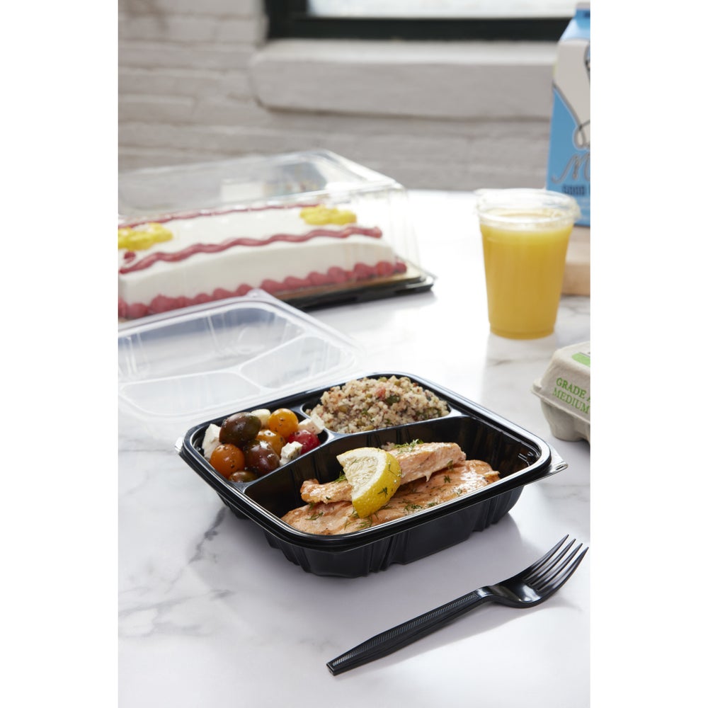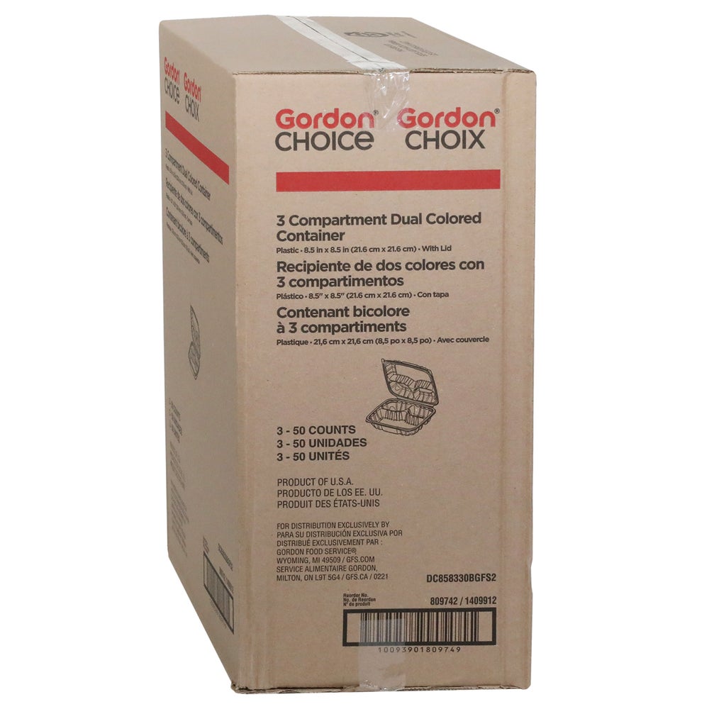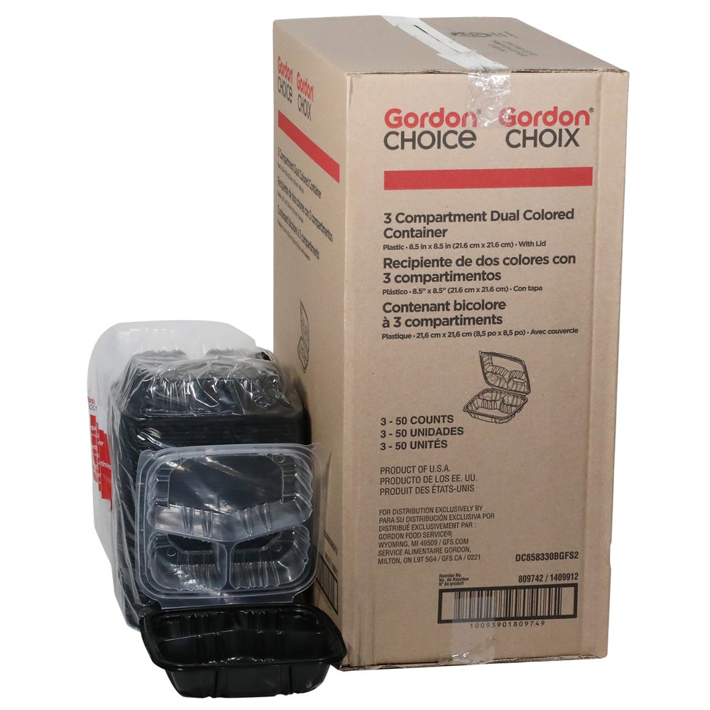 Gordon Choice 8.5 x 8.5 Inch Plastic 3-Compartment Containers, With Hinged Lid, Microwavable, 50 Ct Bag, 3/Case
