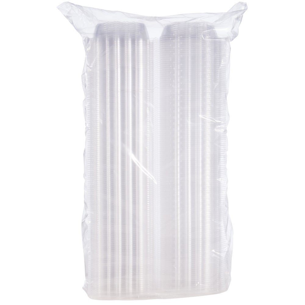 This plastic dessert container features a hinged lid, and is clear for visibility of contents.