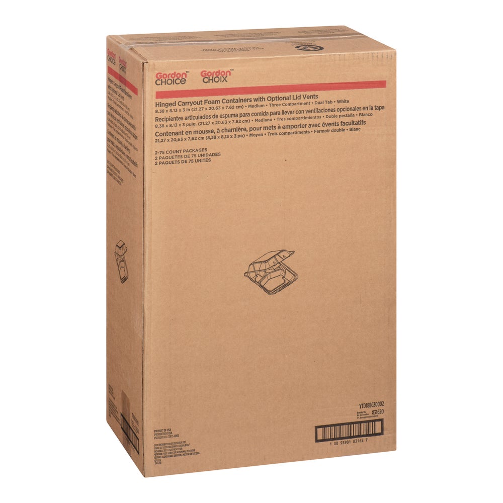 Gordon Choice Medium 8 x 8 x 3 Inch Foam 3-Compartment Containers, White, Hinged, with Optional Venting, Polystyrene, 75 Ct Package, 2/Case