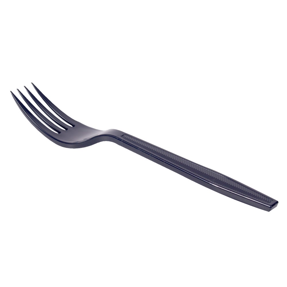 - These black, heavy-weight plastic forks are perfect for catering and entertaining, and they stand up to the toughest food demands. With an attractive etched handle, the forks look like permanent-ware and have the cost and convenience of a disposable item.