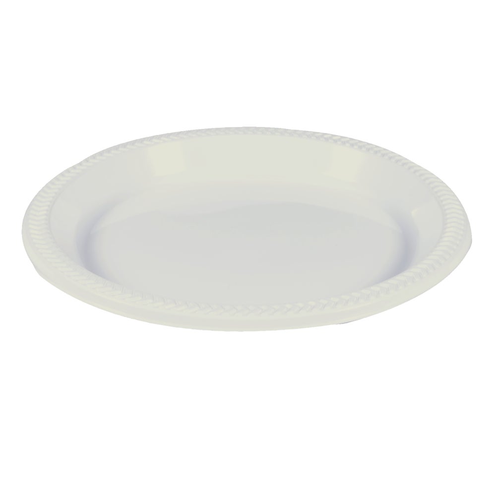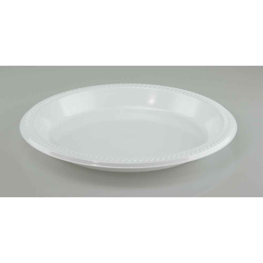 - These cut-resistant, leak-proof plastic plates have a high sheen for an upscale look. The white, nine-inch plates can withstand heavy foods and may be used for hot or cold applications.