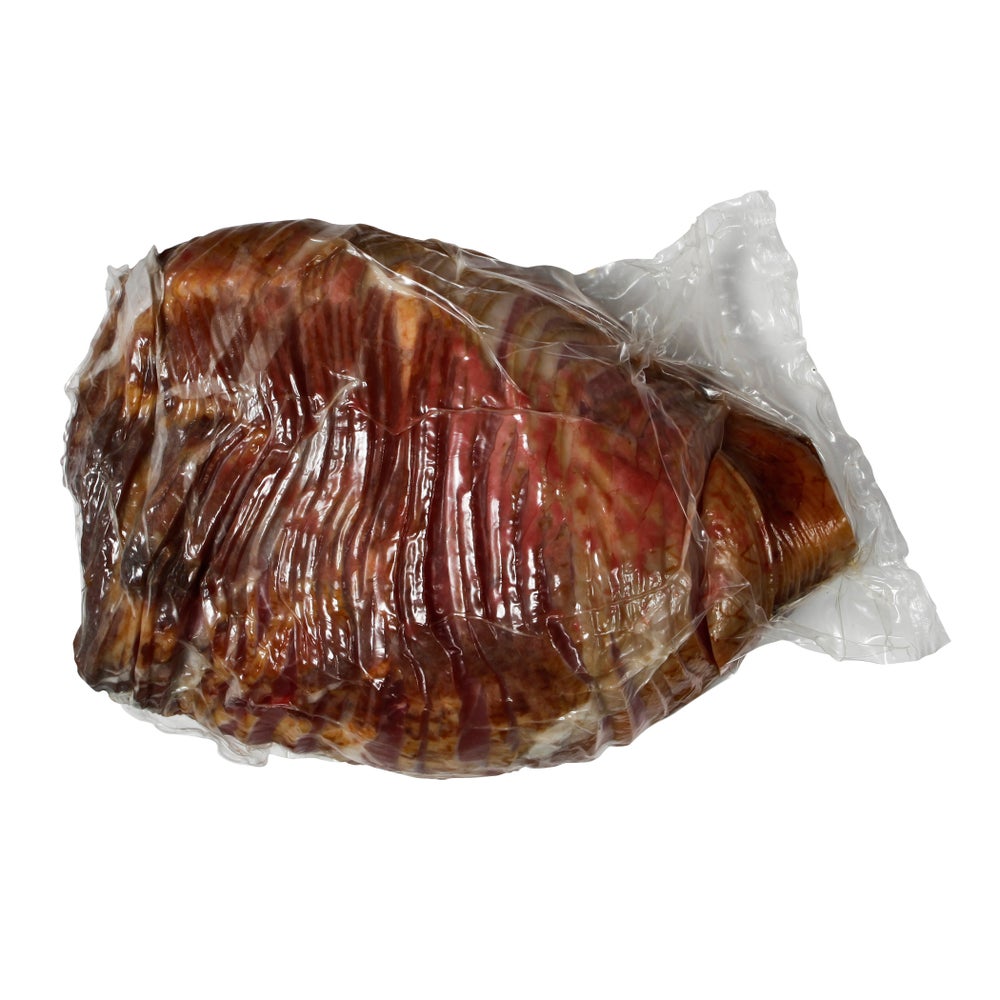 Este jamón campestre en rodajas se ha curado en seco con sal y azúcar, luego se ahumó y añejó para proporcionar un sabor rico y sabroso. Cortado en rodajas de tamaños y grosores aleatorios, este jamón incluye codillos ahumados que se pueden usar para condimentar verduras y recortes que se pueden usar en sopas.