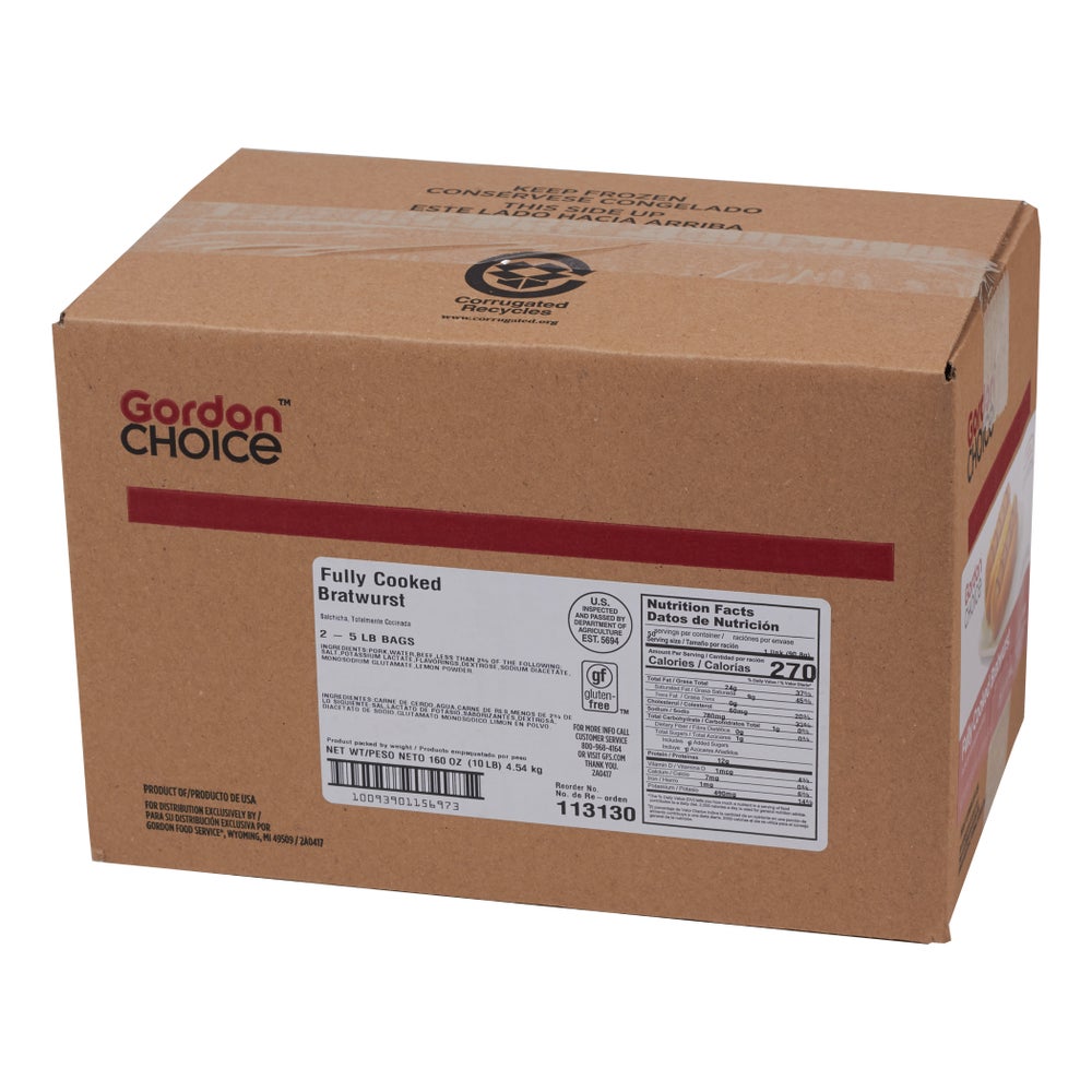 Salchicha de carne de res y cerdo Bratwurst, enlaces, 5 unidades por libra, cocida, congelada, 5 Libr Bol, 2/Caj