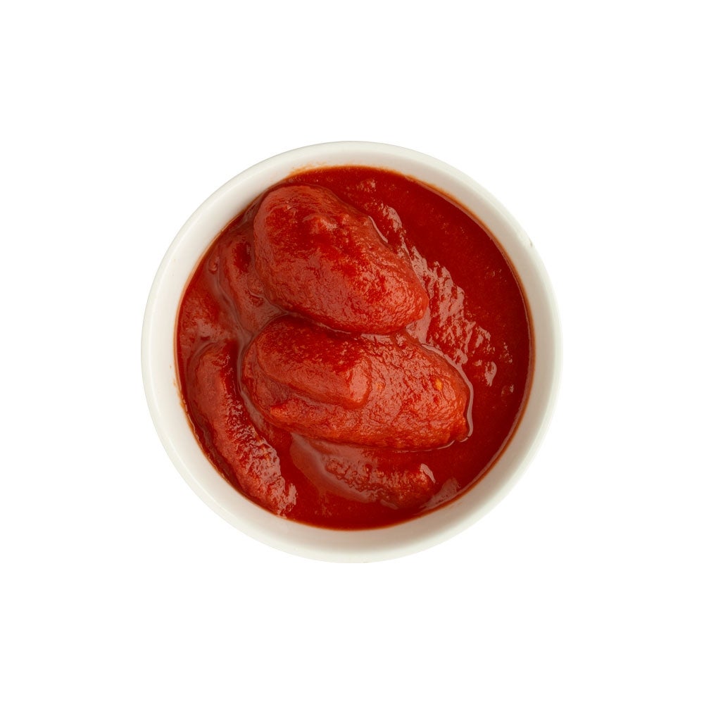 Tomates ciruela enteros y pelados, en salmuera, con albahaca, en puré, n.º 10, 106 Onz Paq, 6/Caj