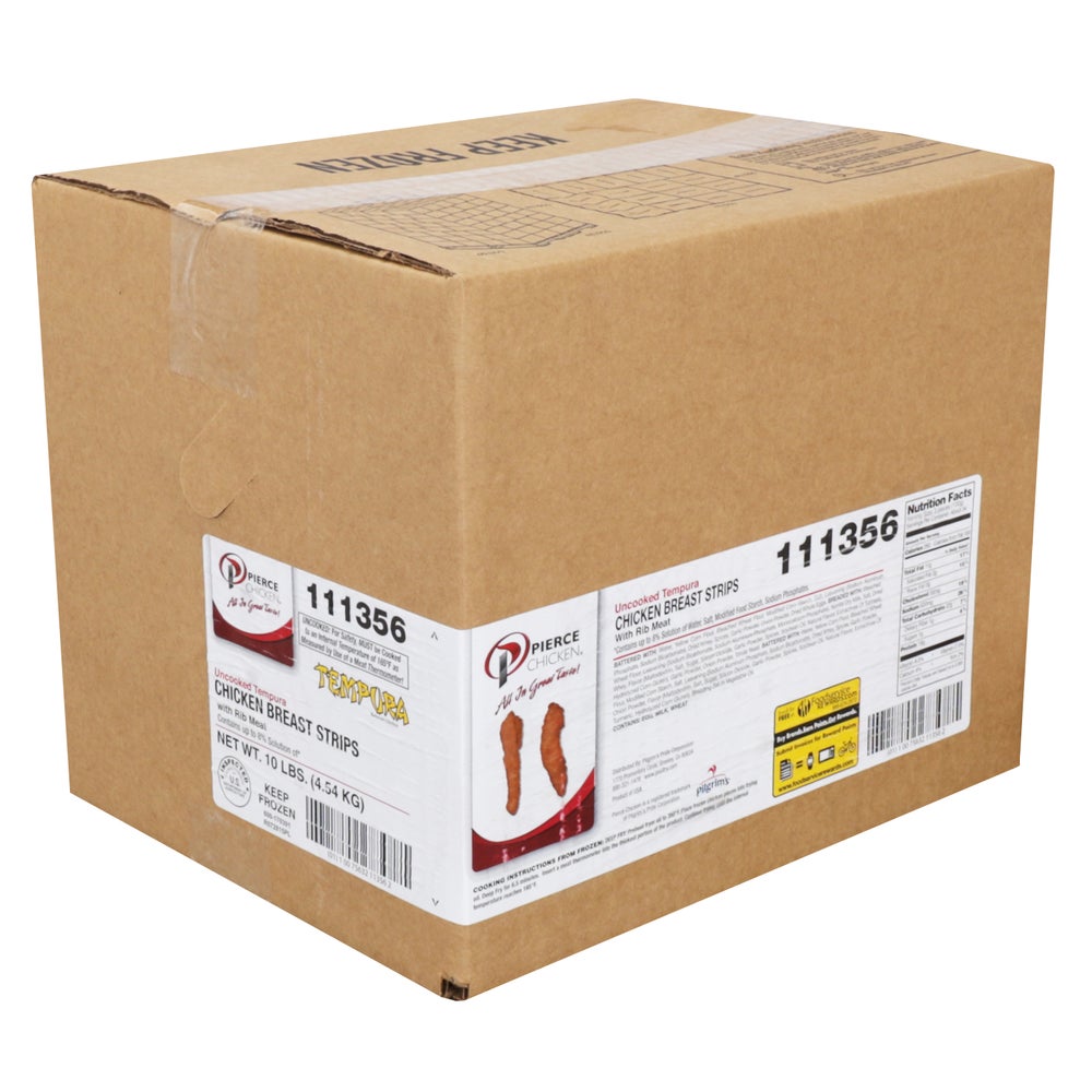 Tiras de pollo empanizado con tempura, carne de pechuga, crudo, congelado, 5 Libr Bol, 2/Caj
