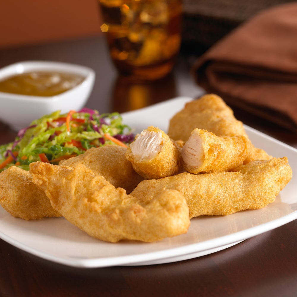 Disfrute de la textura ligera y crujiente del pollo tempura sin la molestia de prepararlo en la cocina. Las tiras de pechuga de pollo empanizadas en tempura son ideales para mojar