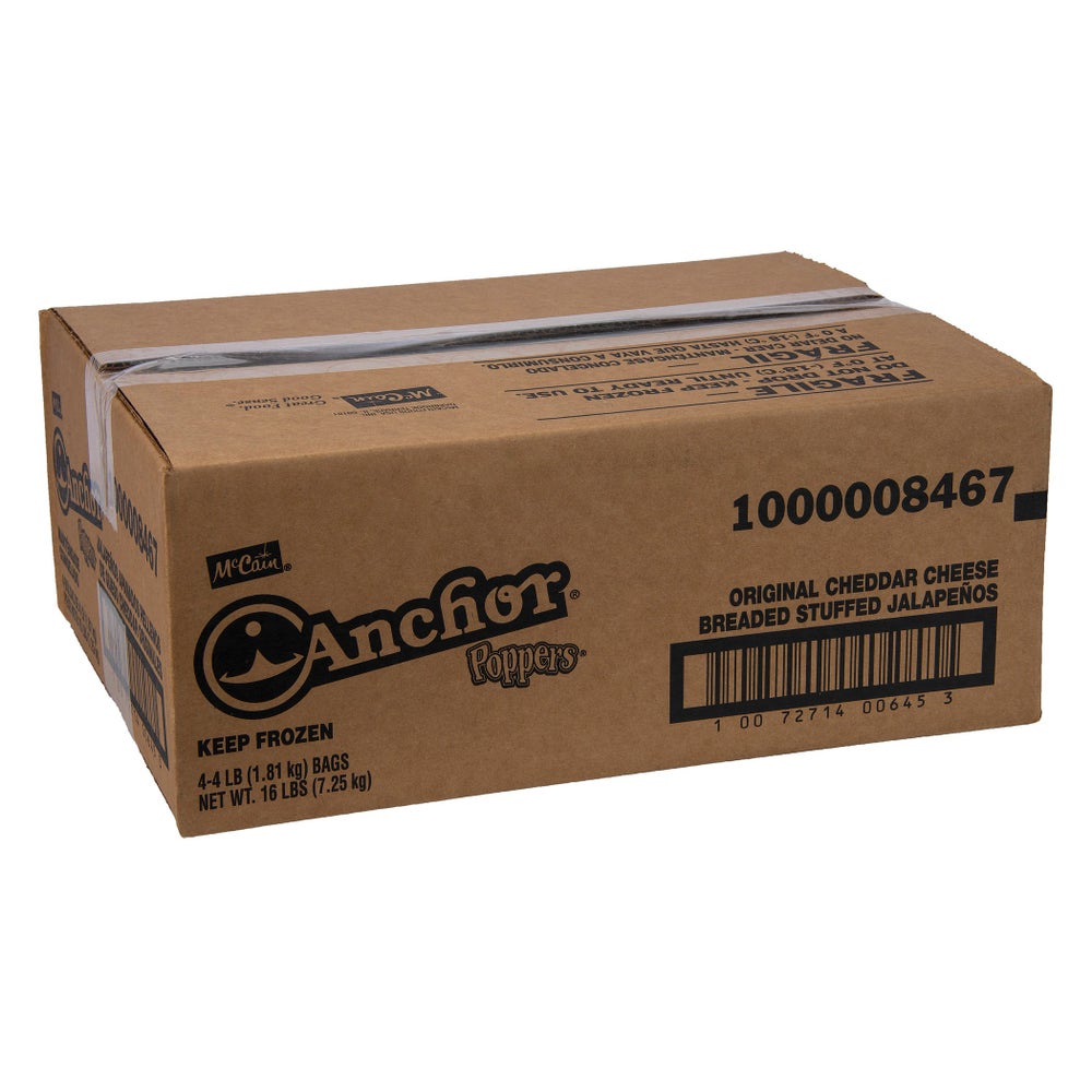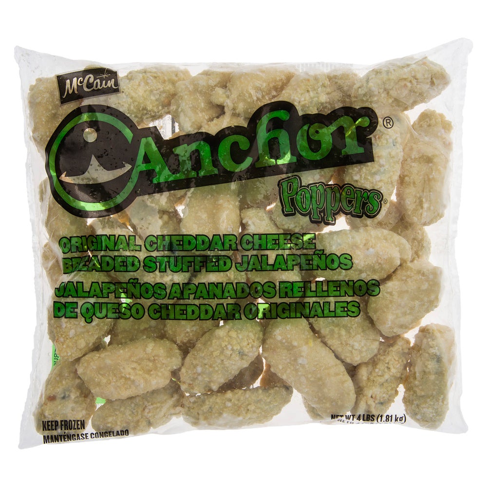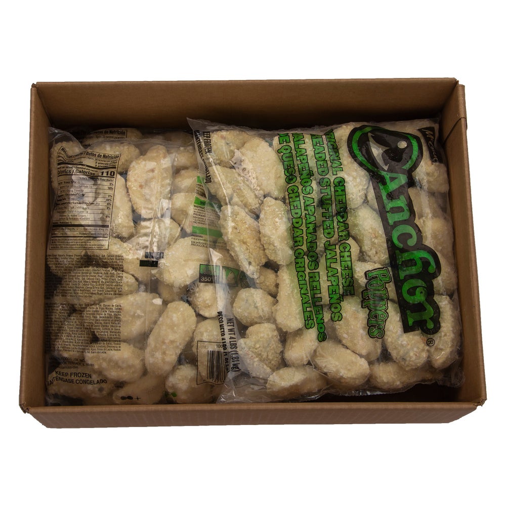Mitades de jalapeños rellenas de queso cheddar empanizado, congeladas individualmente, 4 Libr Cjs, 4/Caj