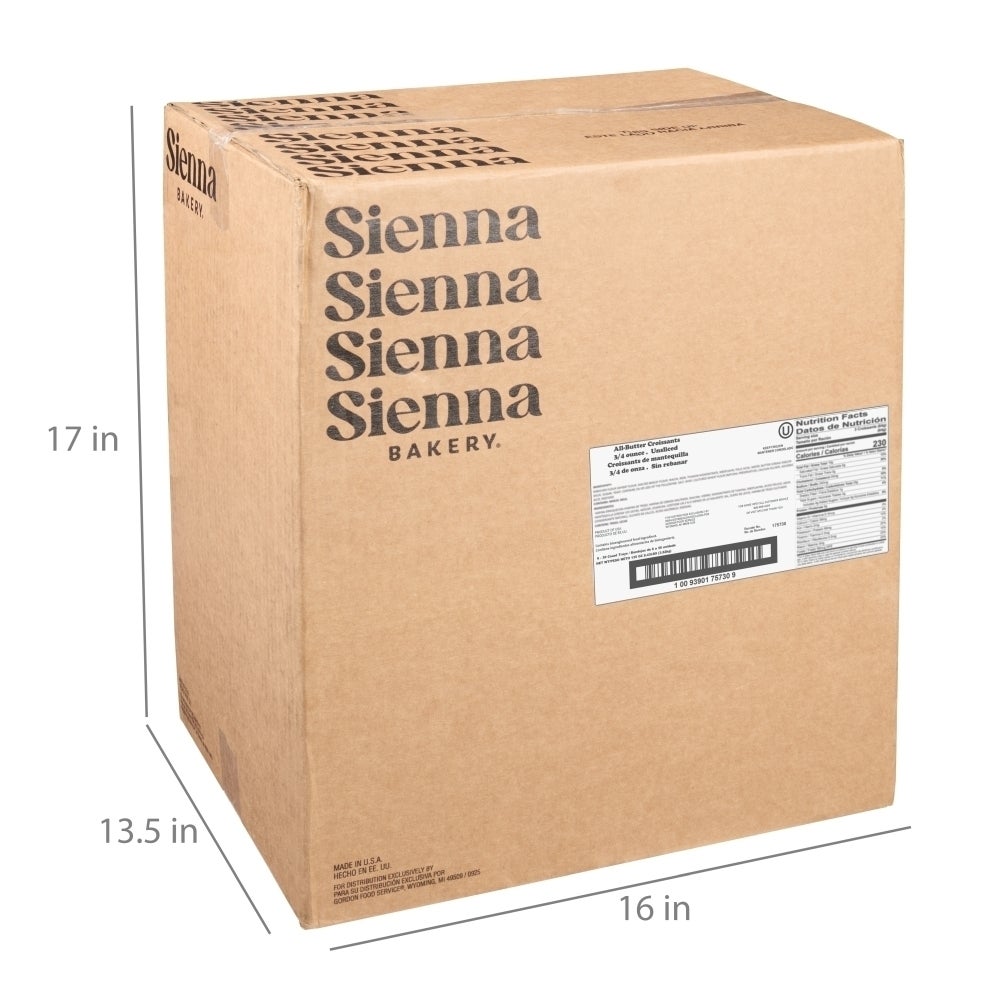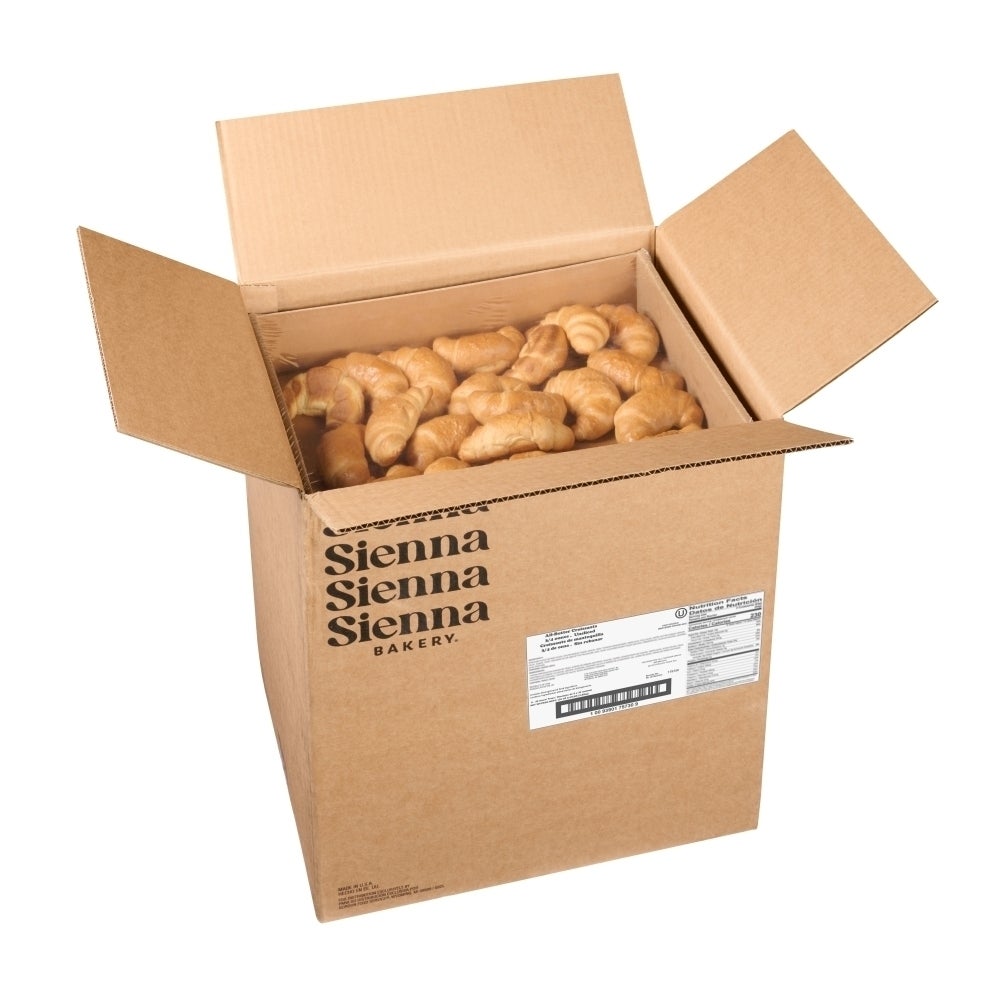 El empaque de doble caja ayuda a mantener la integridad del producto. Estos croissants de 0.75 onzas vienen en cajas de 30 unidades, seis por paquete.