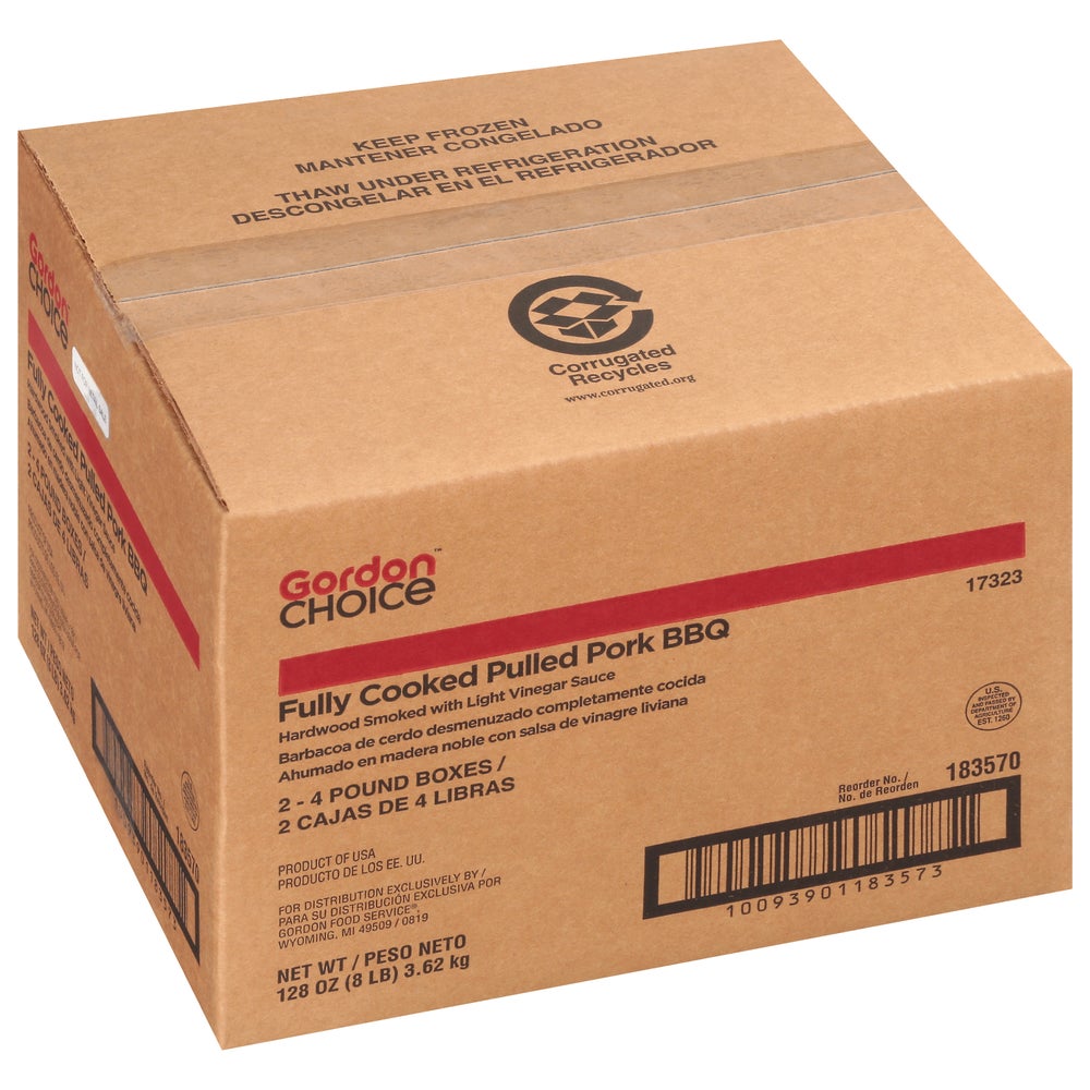 Barbacoa de puerco ahumada con nogal americano, con salsa de vinagre ligera, cocida, congelada, 4 Libr Ban, 2/Caj