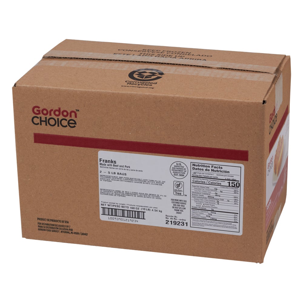 Salchichas de carne de res y cerdo, 6 pulgadas, 10 unidades por libra, congeladas, 5 Libr Bol, 2/Caj