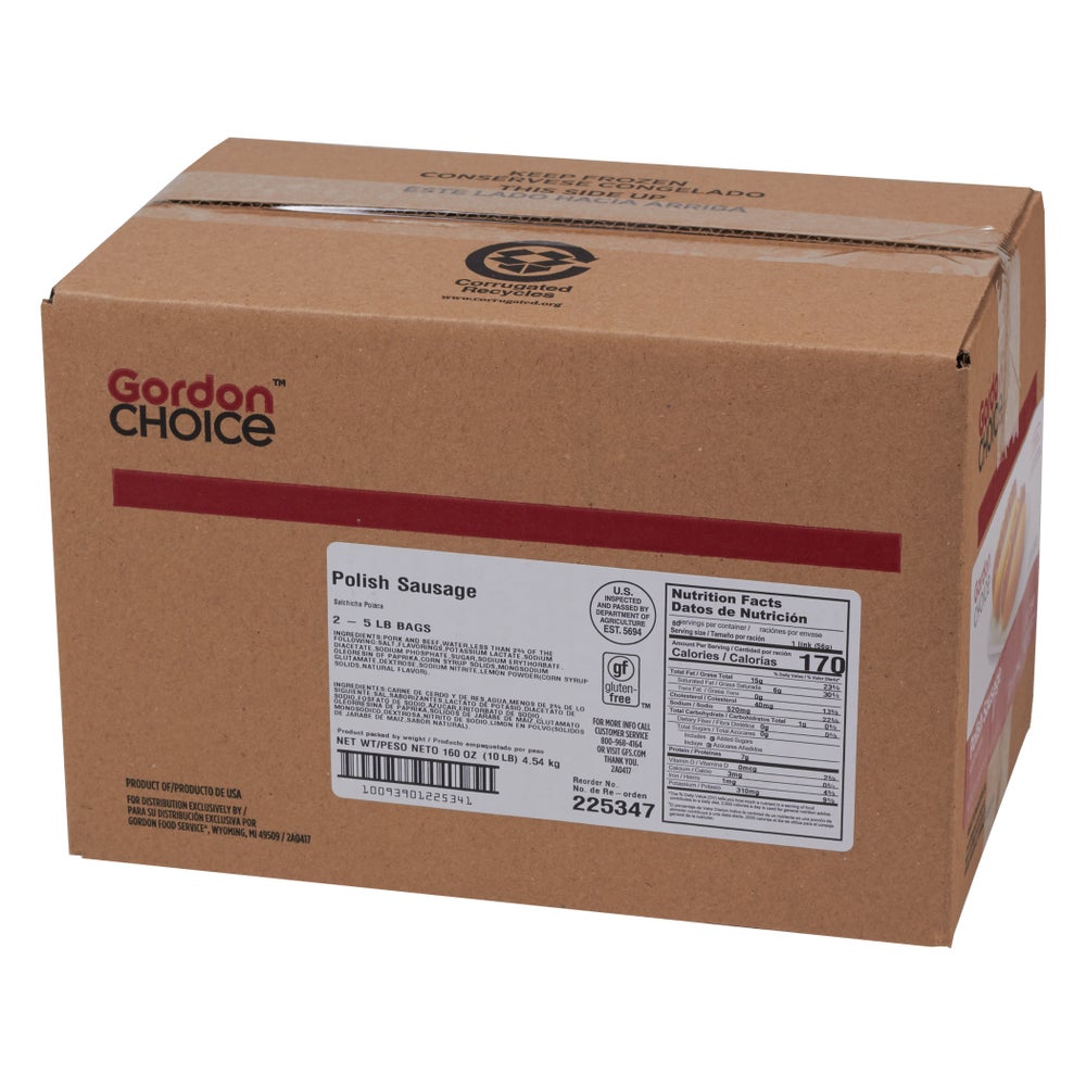 Salchicha de carne de res y cerdo polaca, 6 pulgadas, enlaces, 8 por libra, cocida, congelada, 5 Libr Bol, 2/Caj